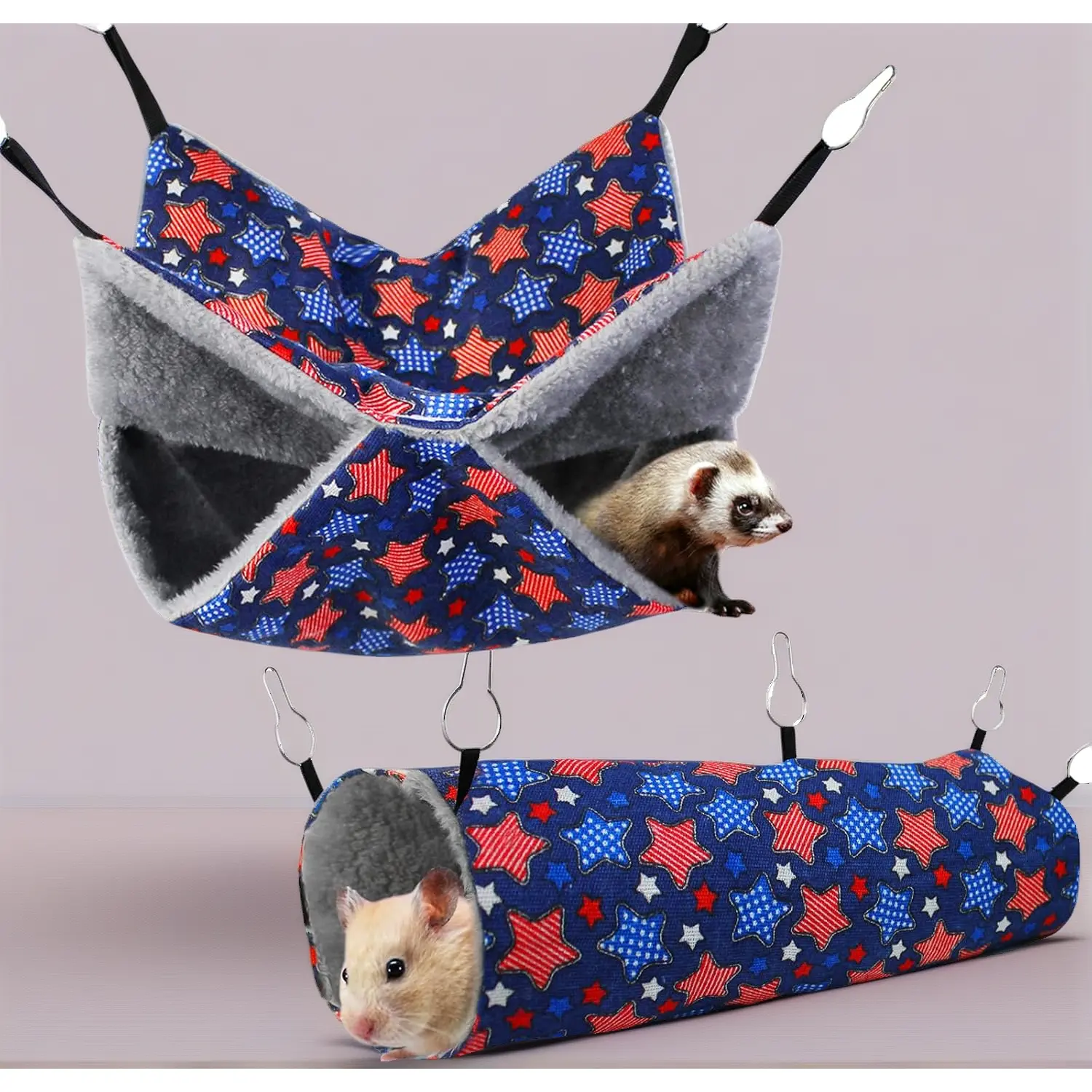 2-Pack Hanging Tunnel & Hammock Set for Ferrets & Chinchillas - Soft Plush Cage Accessories for Climbing, Hiding, Sleeping. Multi-Level Small Animal Play & Rest Area