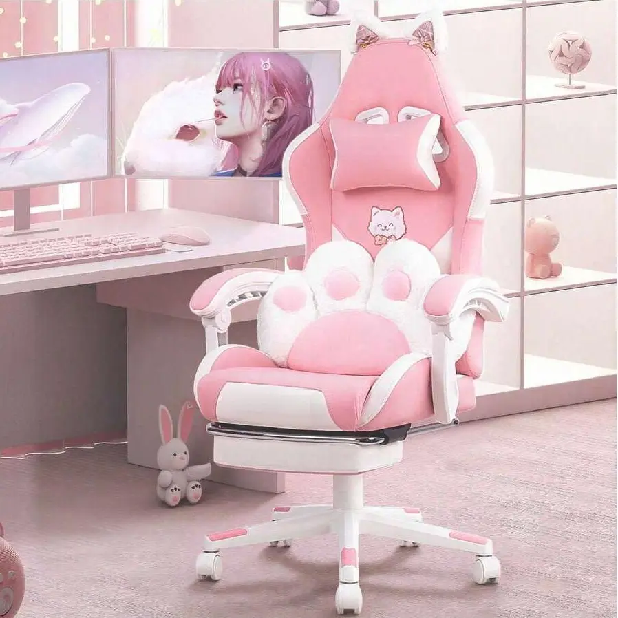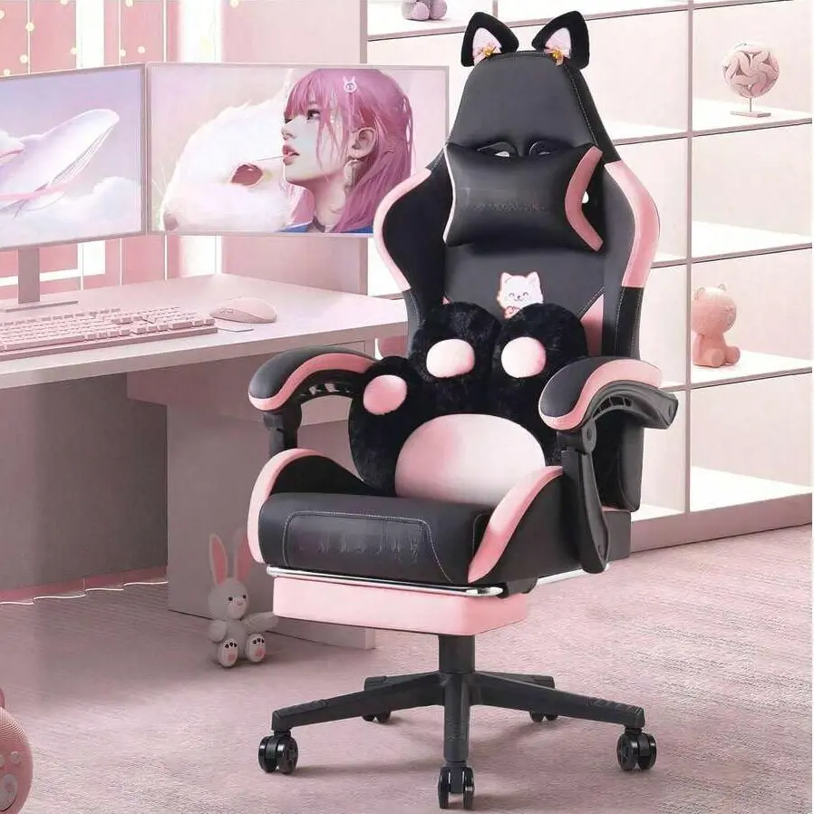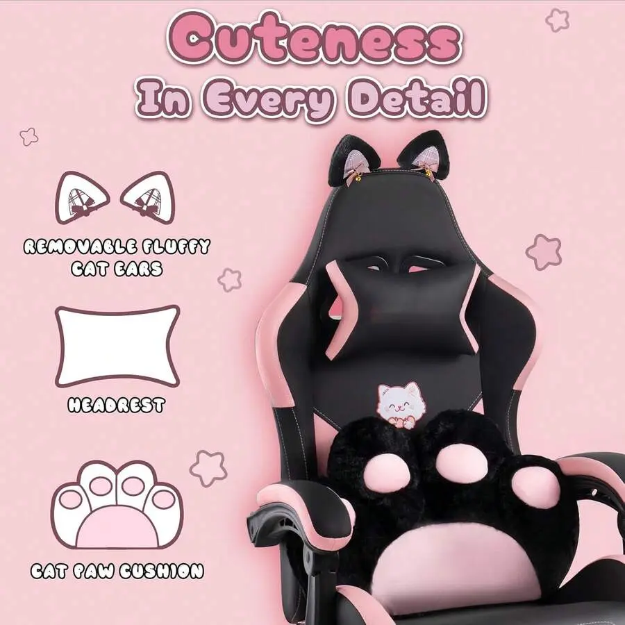 Super Cute: We've added cute cat ears to this gaming chair by replacing the regular lumbar pillow with a cat paw shaped lumbar pillow, and the cat head embroidery on the backrest makes the chair even more vivid and cute.The cat ears are removable, so you can replace them with your favourite decorations