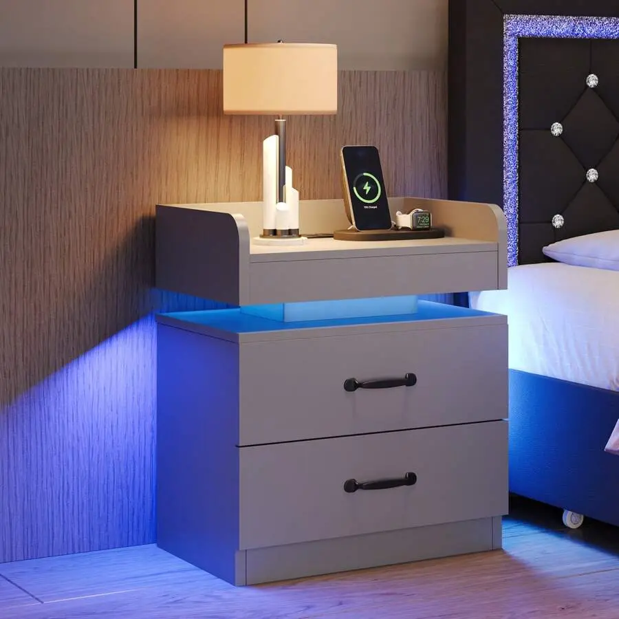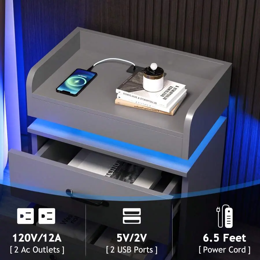 [Blue LED Lights & Charging Station]Blue LED lighting to create an atmosphere in your bedroom.Conveniently charge your devices with two power outlets and two USB ports built into this bedside table.