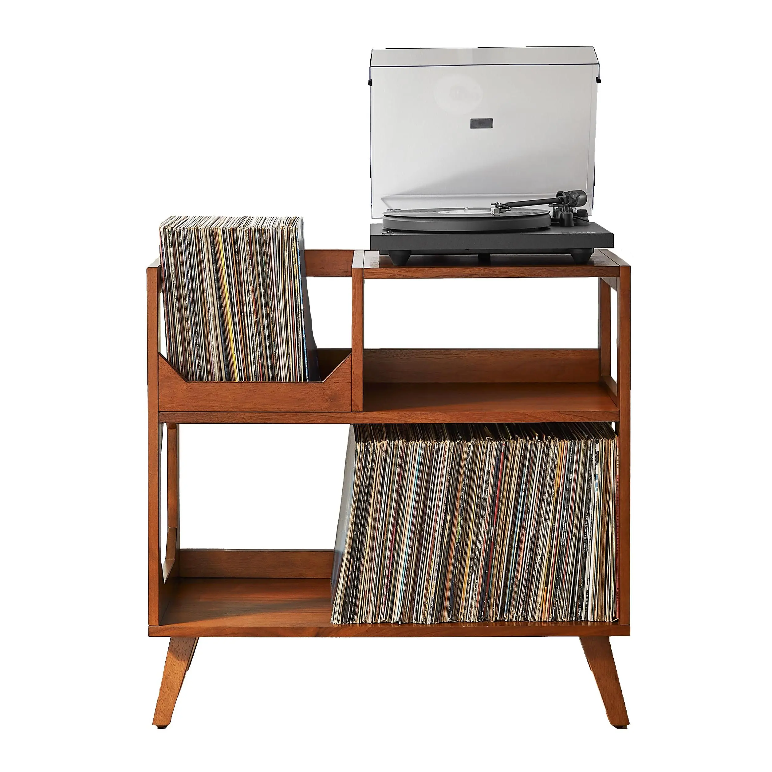 Featuring space for up to 350 records, this record player stand incorporates crate-style storage similar to record store flip bins.