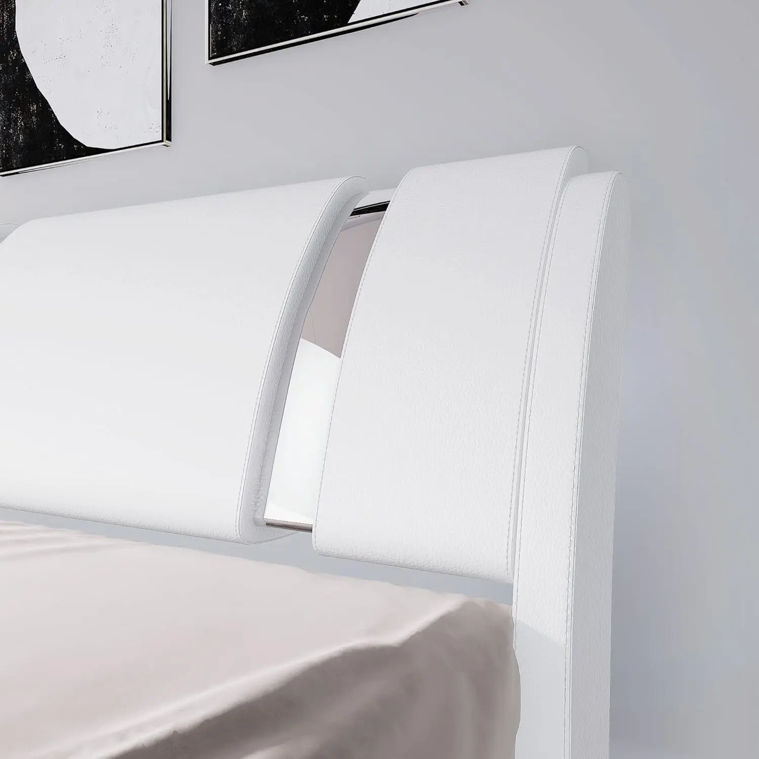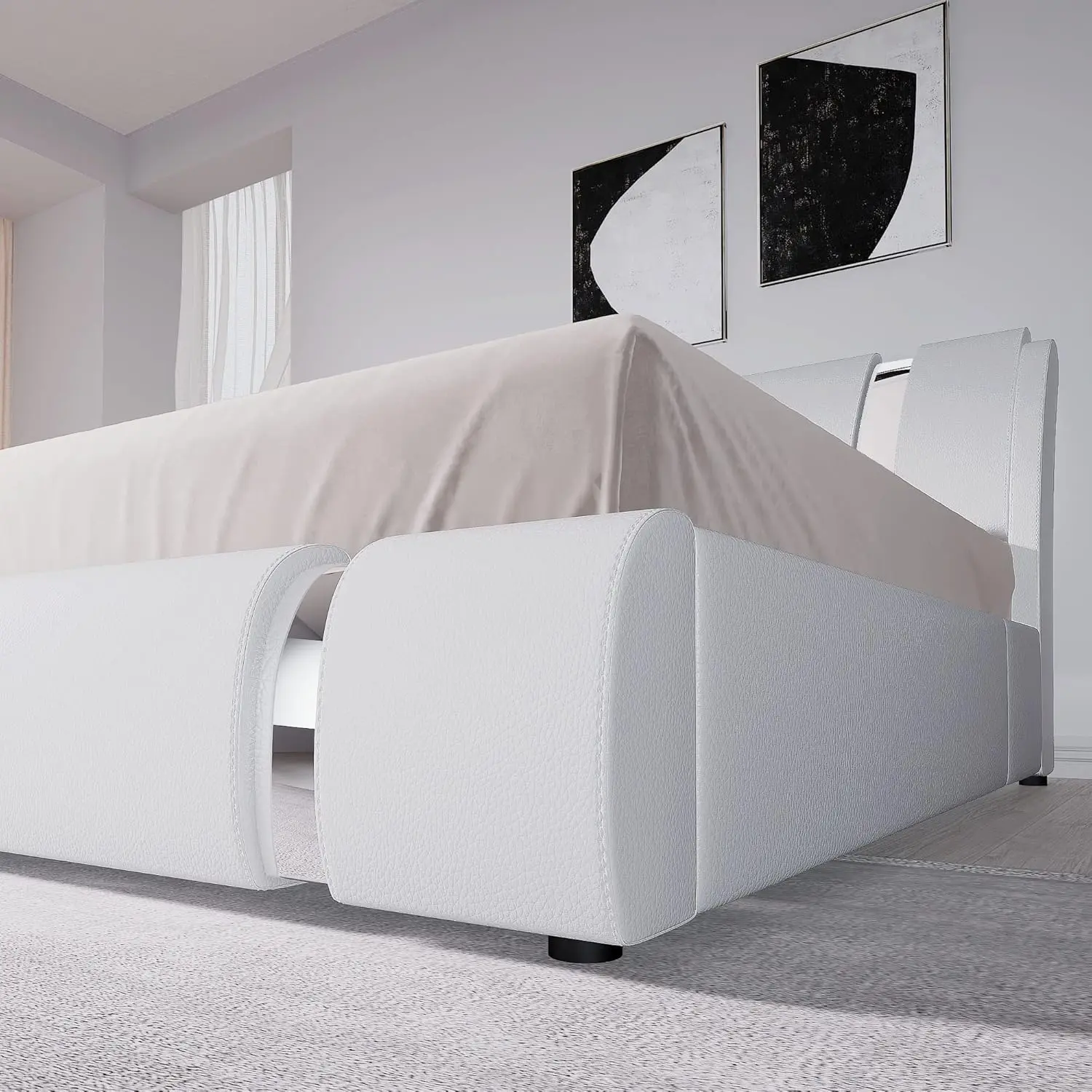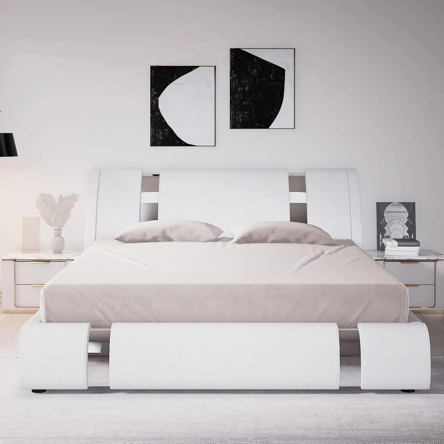 This Allewie Queen Size Platform Bed Frame combines modern aesthetics with functionality. Crafted from faux leather, iron, and wood, it offers a sleek white finish. The curved, adjustable headboard supports your head and back, adjustable from 33.5" to 35.4". Perfect for leaning and reading, it ensures a comfortable resting position. The safe, curved ends prevent injuries, making it ideal for playful moments.