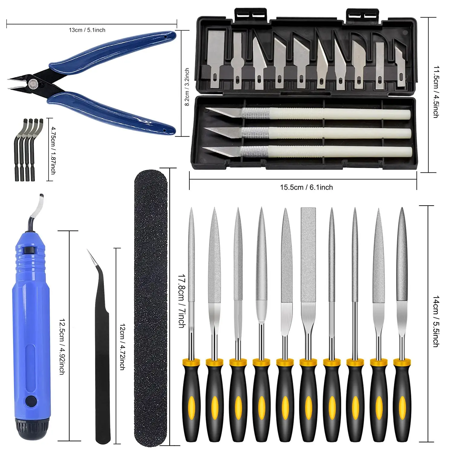 ·Package includes: 1pcs-Knife Clean Up Kit (10 blades with 3 handle), 1pcs-NB1100 Deburring Tool Handle, 5pcs-BS1010 Deburring Blades, 1pcs-double-sided polished bar,1pcs-Pliers,1pcs-Tweezers,1pcs-Needle File Set(different 10pcs) in total 32 piece. Great tool contains everything you need.
