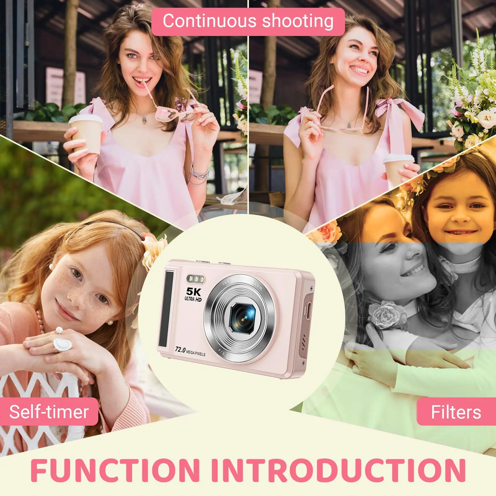 5K & 72MP Digital Camera - Capture ultra-high-resolution 5K videos and 72MP photos. Equipped with the latest CMOS sensor chip, this camera ensures sharp details and vibrant colors. Perfect for birthday parties or school trips, it delivers smooth, high-quality images and videos. No complicated settings needed.