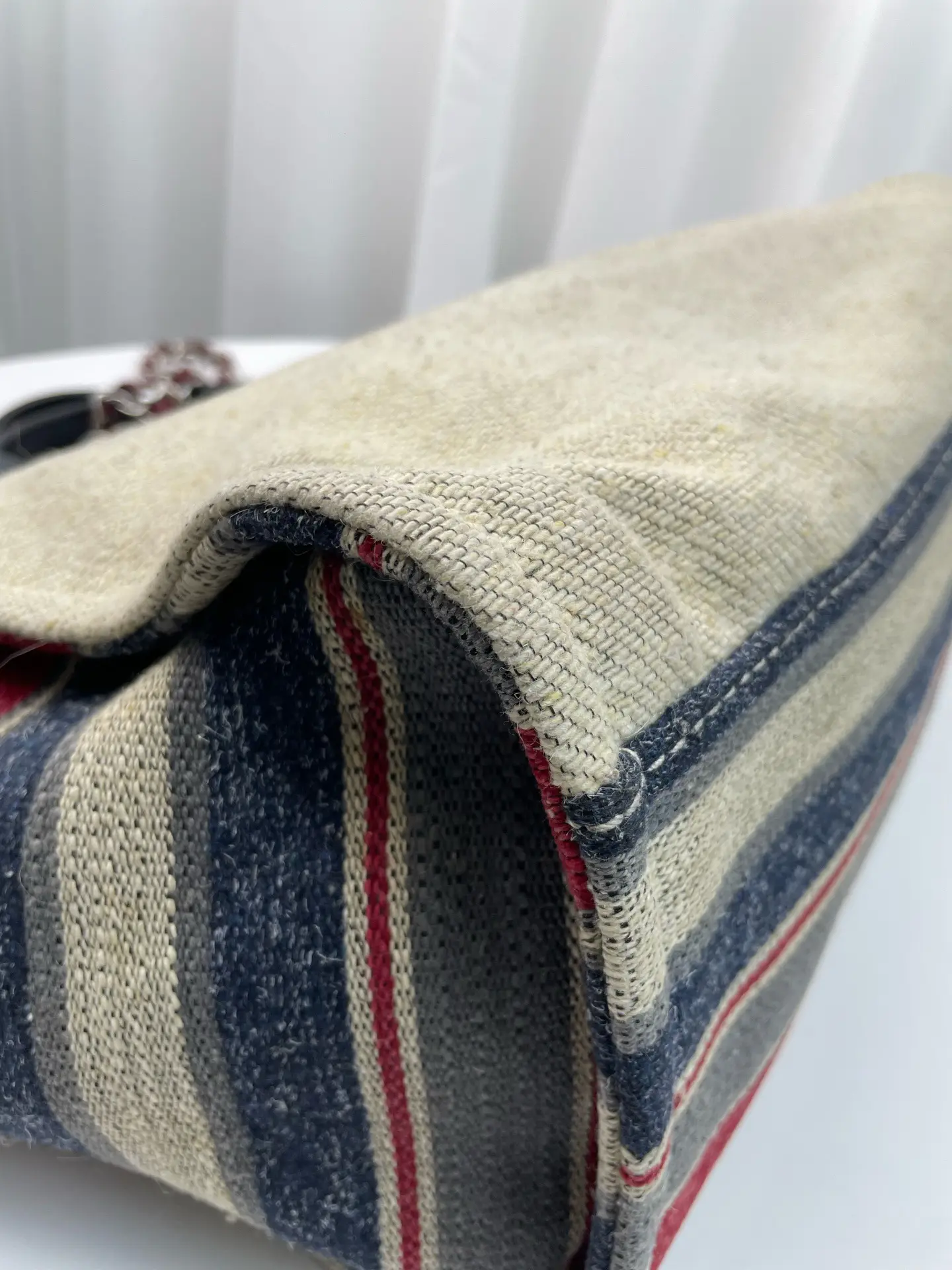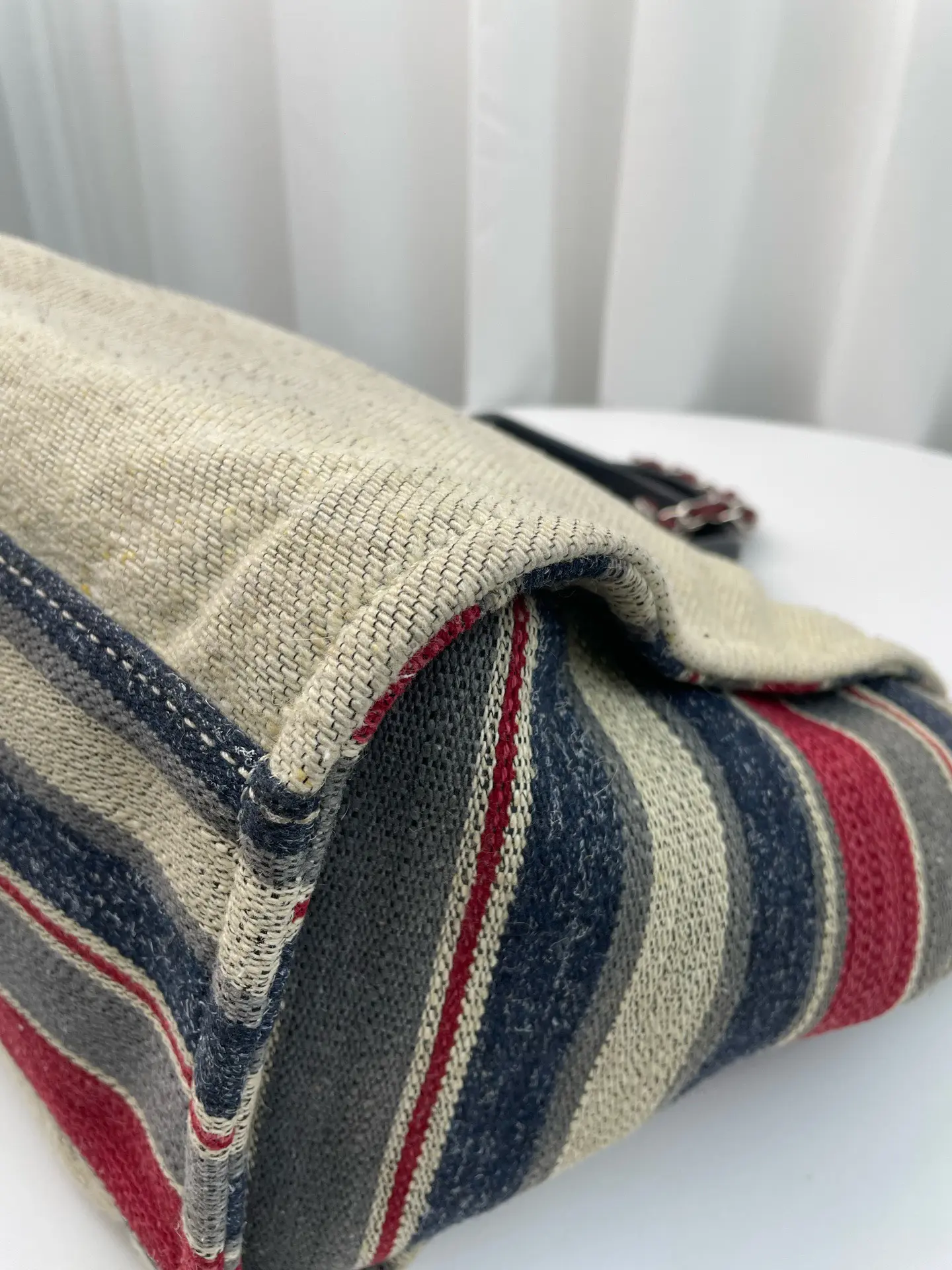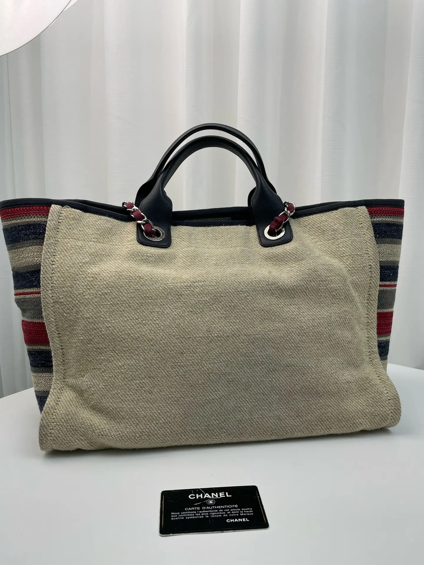 Pre-owned CHANEL canvas Tote Bags Beige Striped Leather Trim Silver Hardware Tote Bag