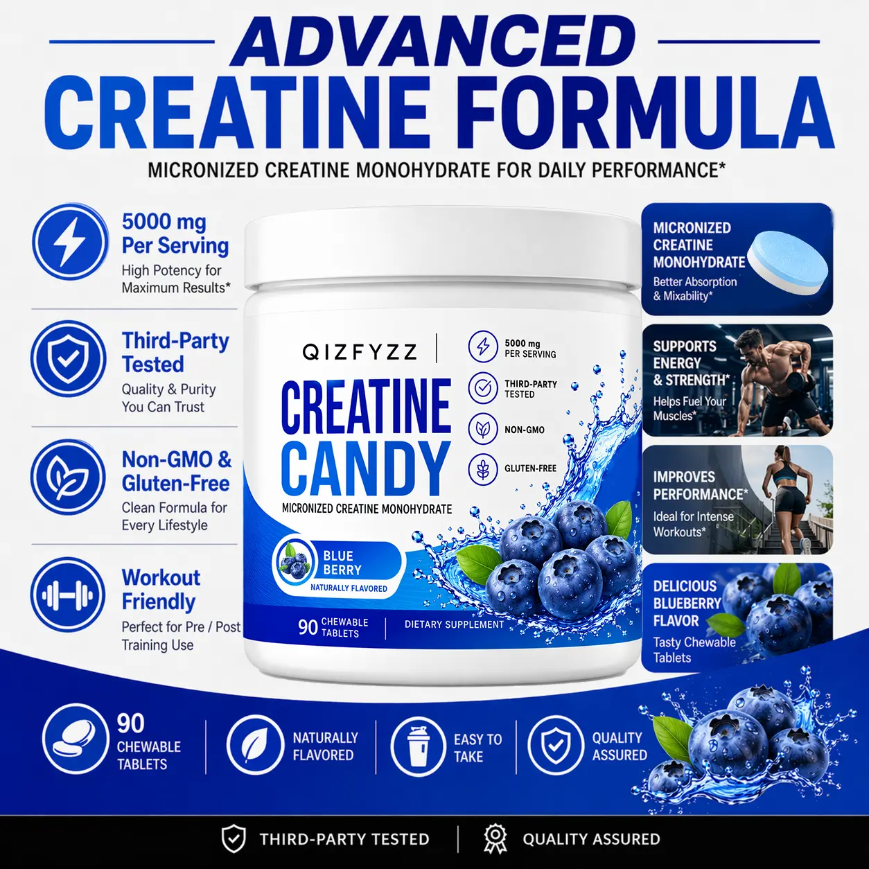 Creatine Chews 5000mg – Blueberry Flavor | Micronized Creatine Monohydrate, 90 Chewable Tablets | Energy, Strength & Workout Performance | No Mixing Required