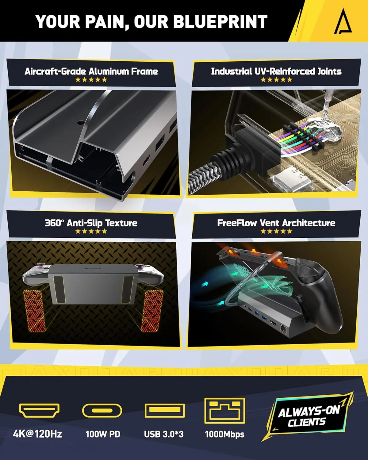 [Tank-Built & Slip-Proof] Aerospace-grade aluminum armor keeps the dock cool during marathon gaming. Extra-large anti-skid pads are 10X bigger than basic docks so your setup stays planted even when things get intense.
