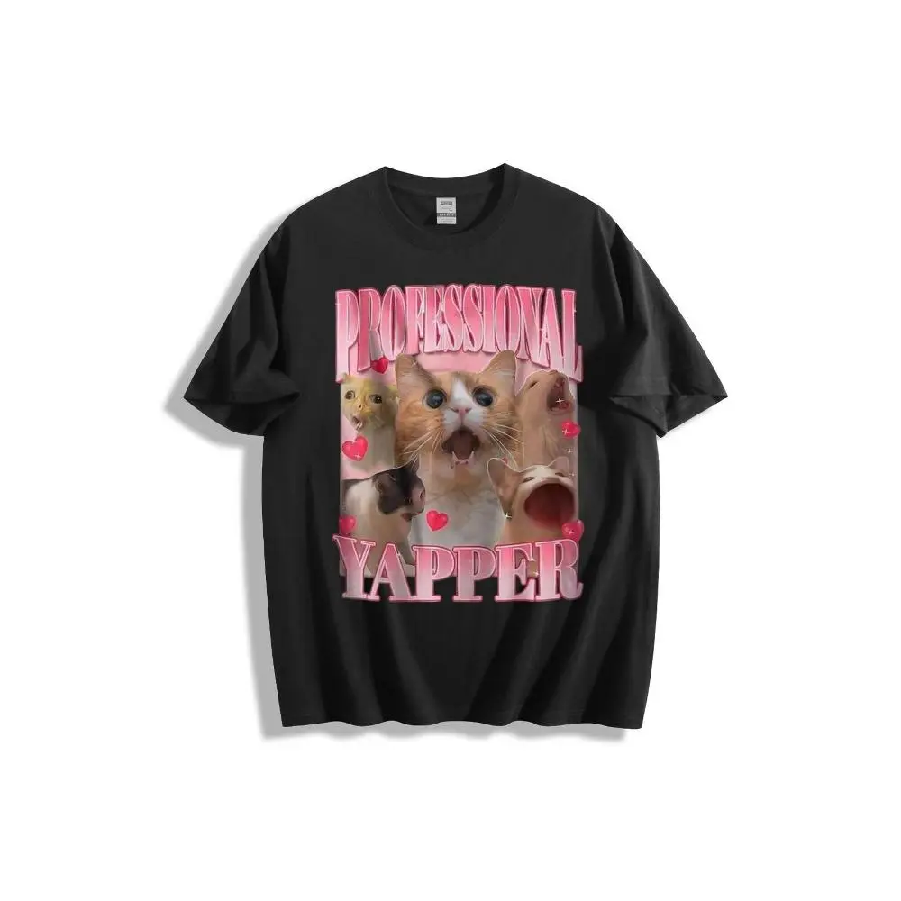 Professional Yapper Graphic Design T-Shirt - Cute Cats & Dogs with Open-Mouthed Expressions, Pink Hearts, Glossy 3D Text, Dark Background, Playful Vibrant Aesthetic - Casual Crew Neck Cotton