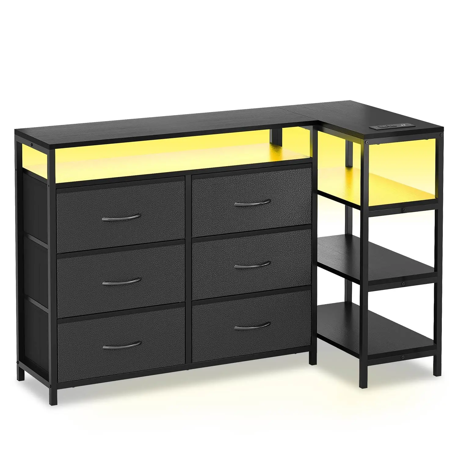 Choose 44.3 inch corner dresser or 53.5 inch long tv stand: L Shaped dresser is perfect for tucking into a corner,53.5 inch long tv stand is suitable for TV up to 60" . The 4 tier open storage rack can be placed left or right to your needs.Kindly note that the storage shelf can be used as an individual product.