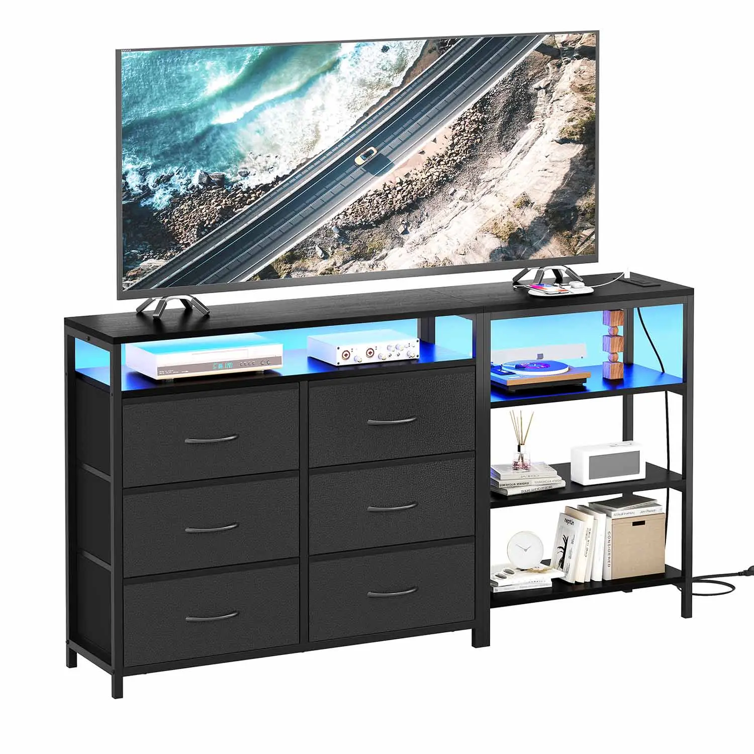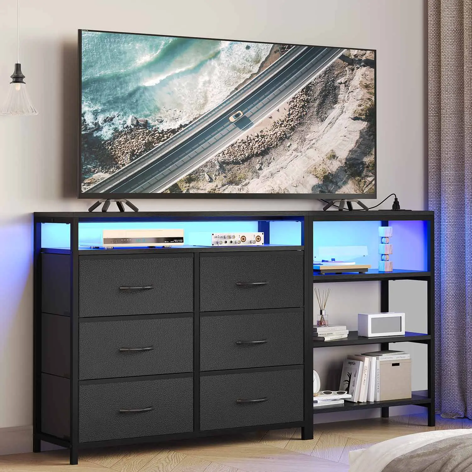 6 large drawers with PU finish, high-end and easy to clean. It can hold your clothes,toys,towels,socks and so on. spacious desktop and open shelf offer sufficient storage for your TV Accessories.
