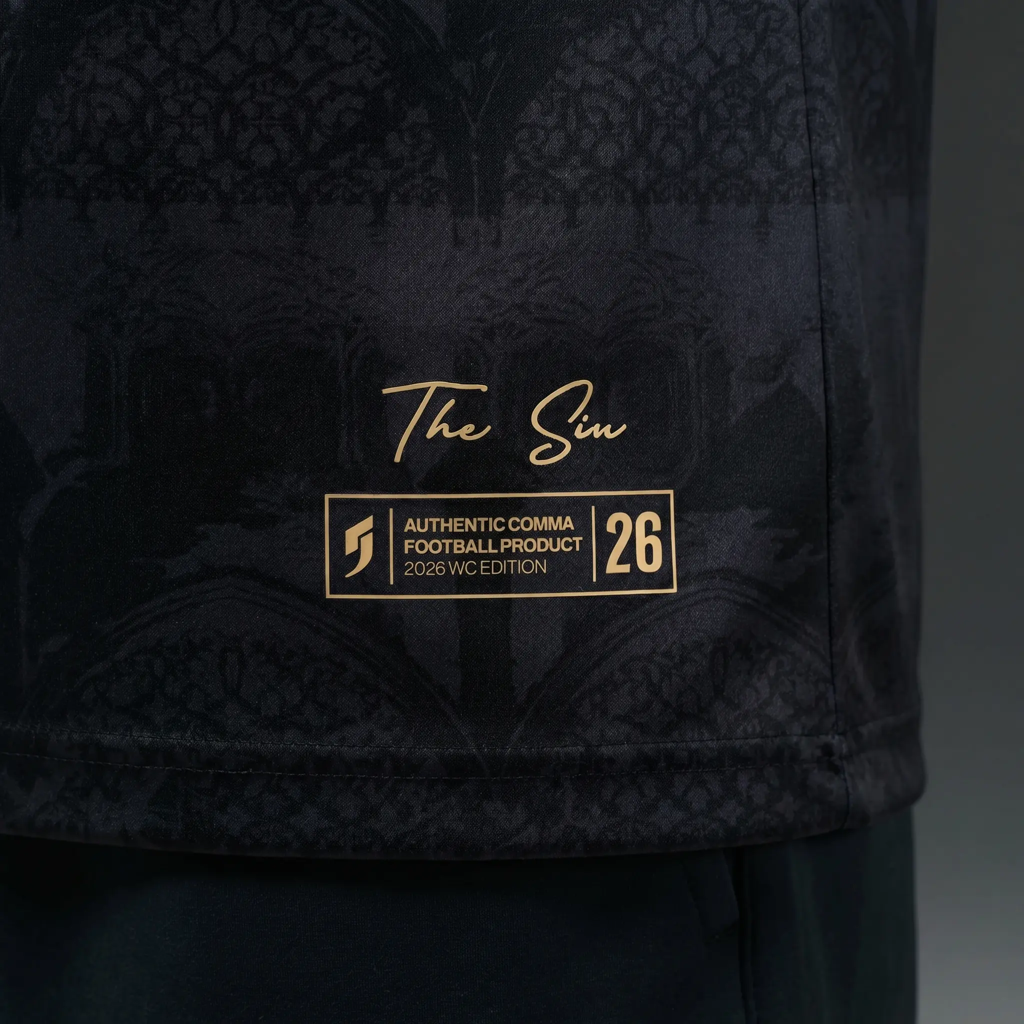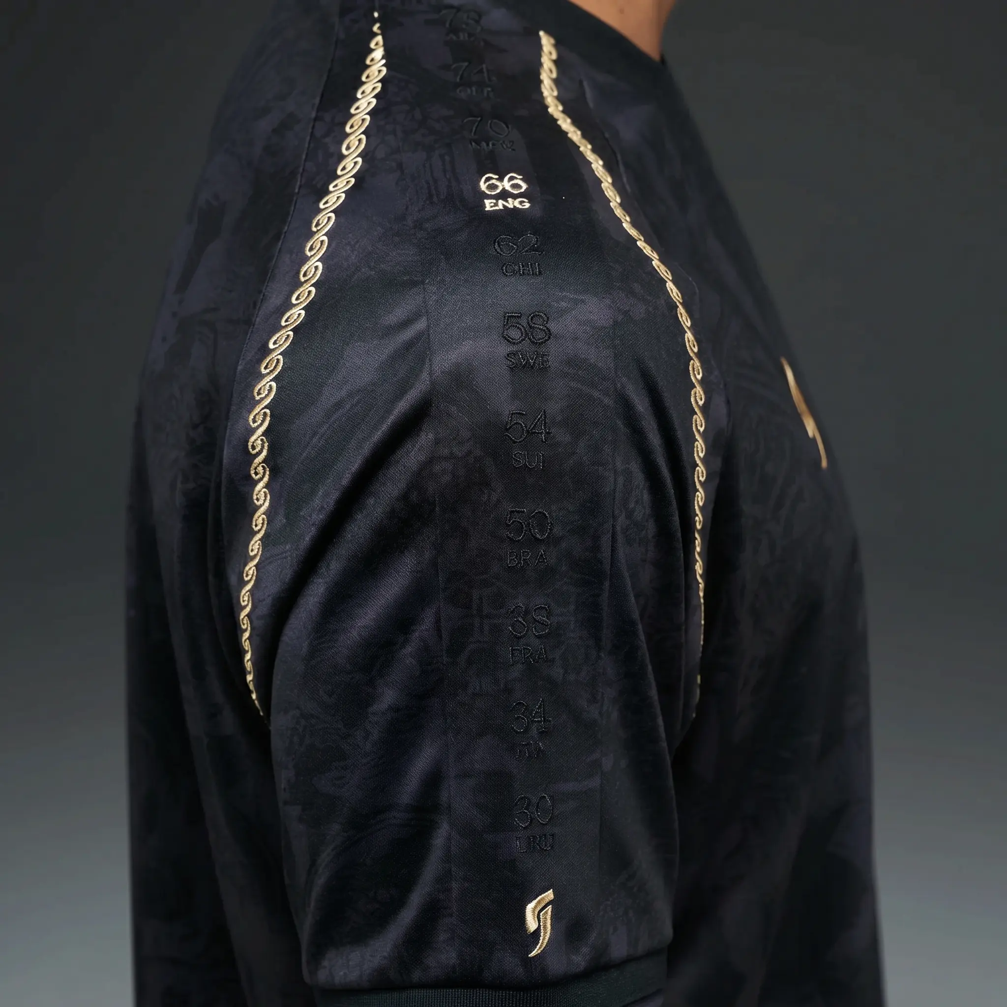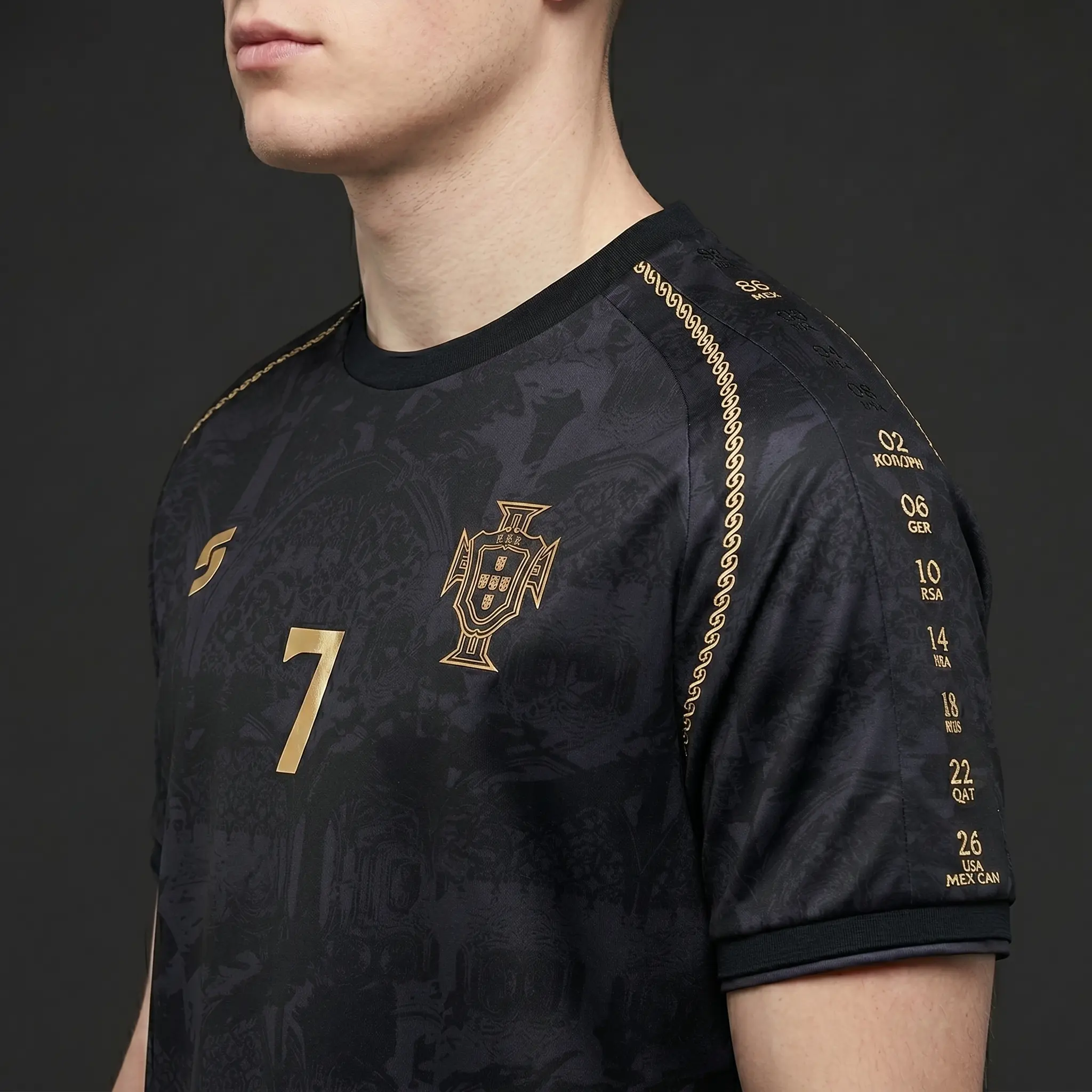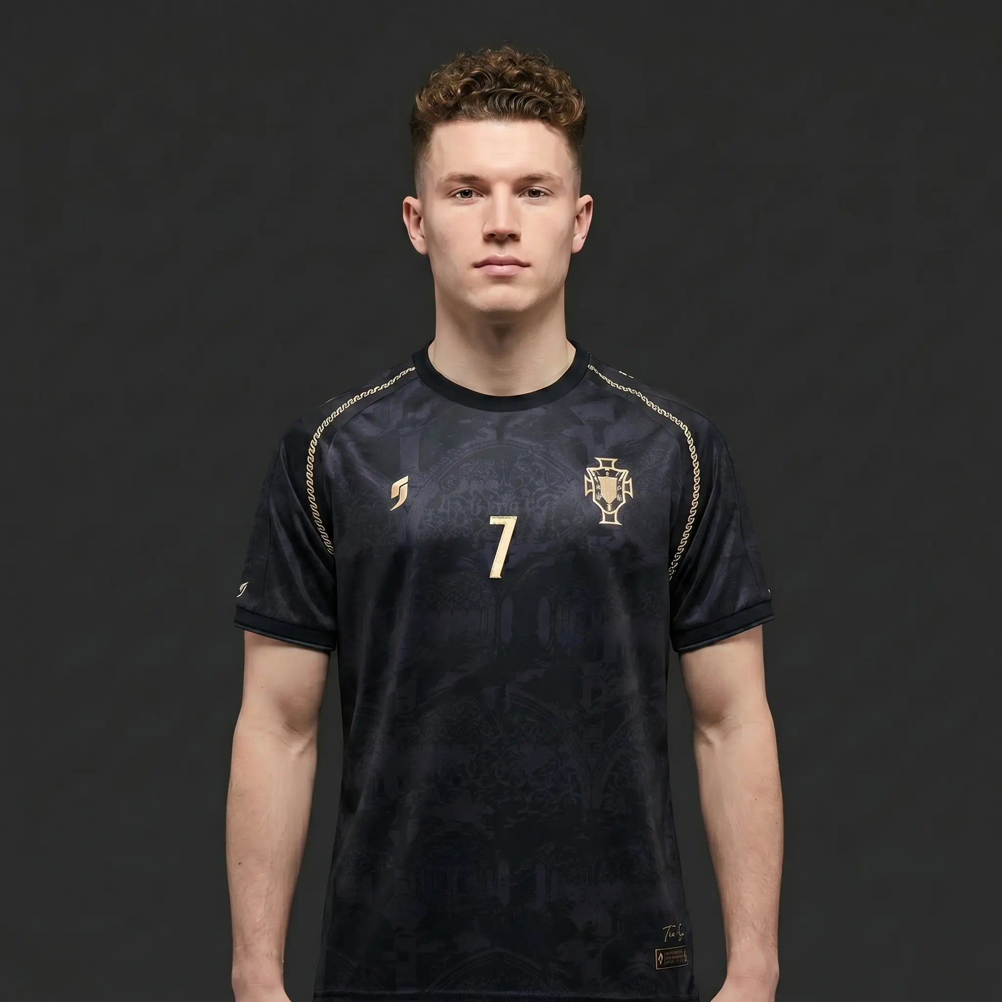 Designed as the must-have Number 7 Siu Jersey, Black Portugal Jersey, and Gold Portugal Jersey. Featuring the iconic Portugal shield, striking gold Number 7 at center, luxurious gold chain details on the shoulders, and a sophisticated dark all-over pattern on premium black fabric.