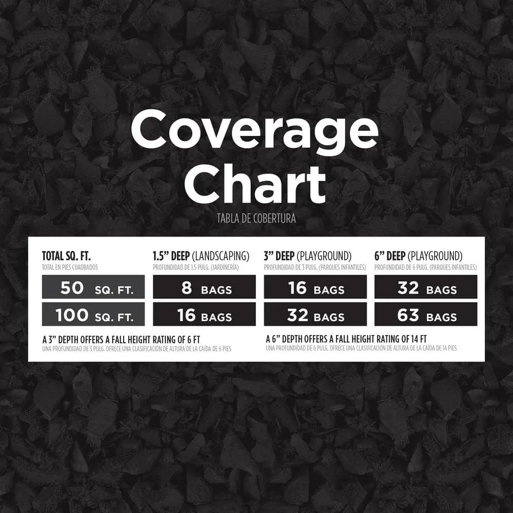 ·2x the coverage of wood mulch, 6.4 sq ft at 1.5" depth (compared to 3.2 sq ft at 3" depth)