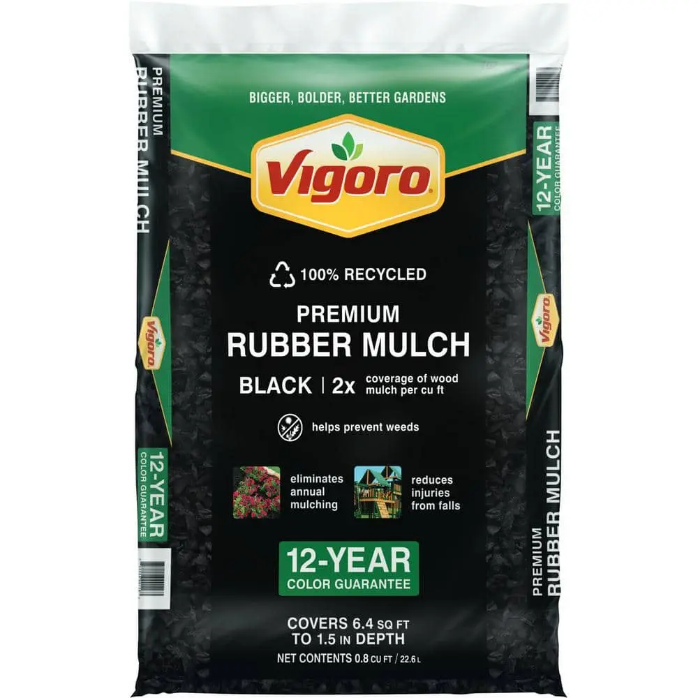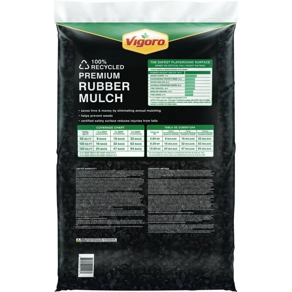 Additionally, rubber mulch is also the safest and softest ground cover for playgrounds. IPEMA certified for critical fall height protection (ASTM F1292-13) means our rubber mulch for playground is safer than outdoor wood mulch and soil. Made from 100% recycled rubber, our yard mulch does not attract carpenter ants or termites, making it a great garden mulch for plants, as it's also dark mulch with weed control. Get over a decade's worth of savings when you switch to Vigoro Rubber Nugget Mulch.