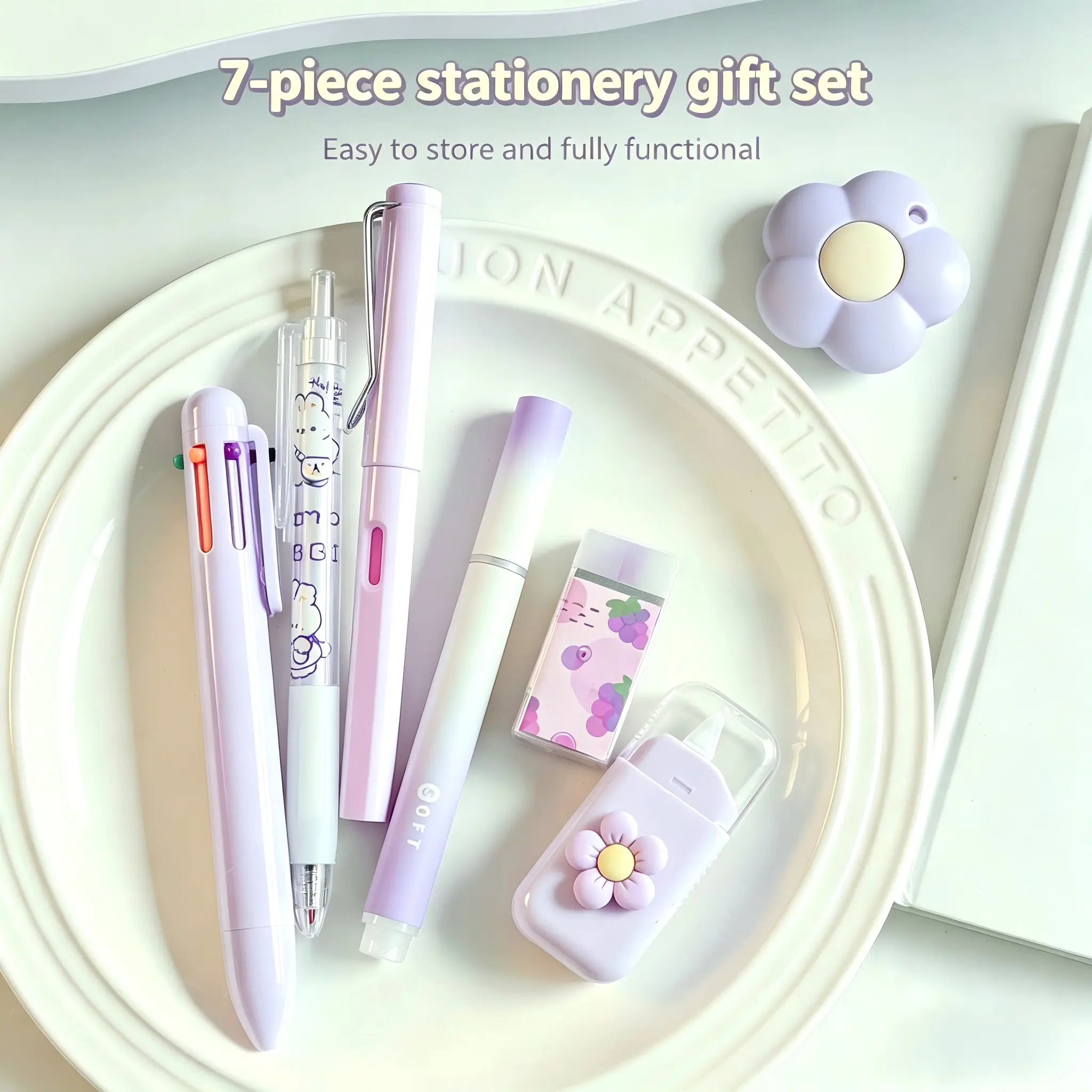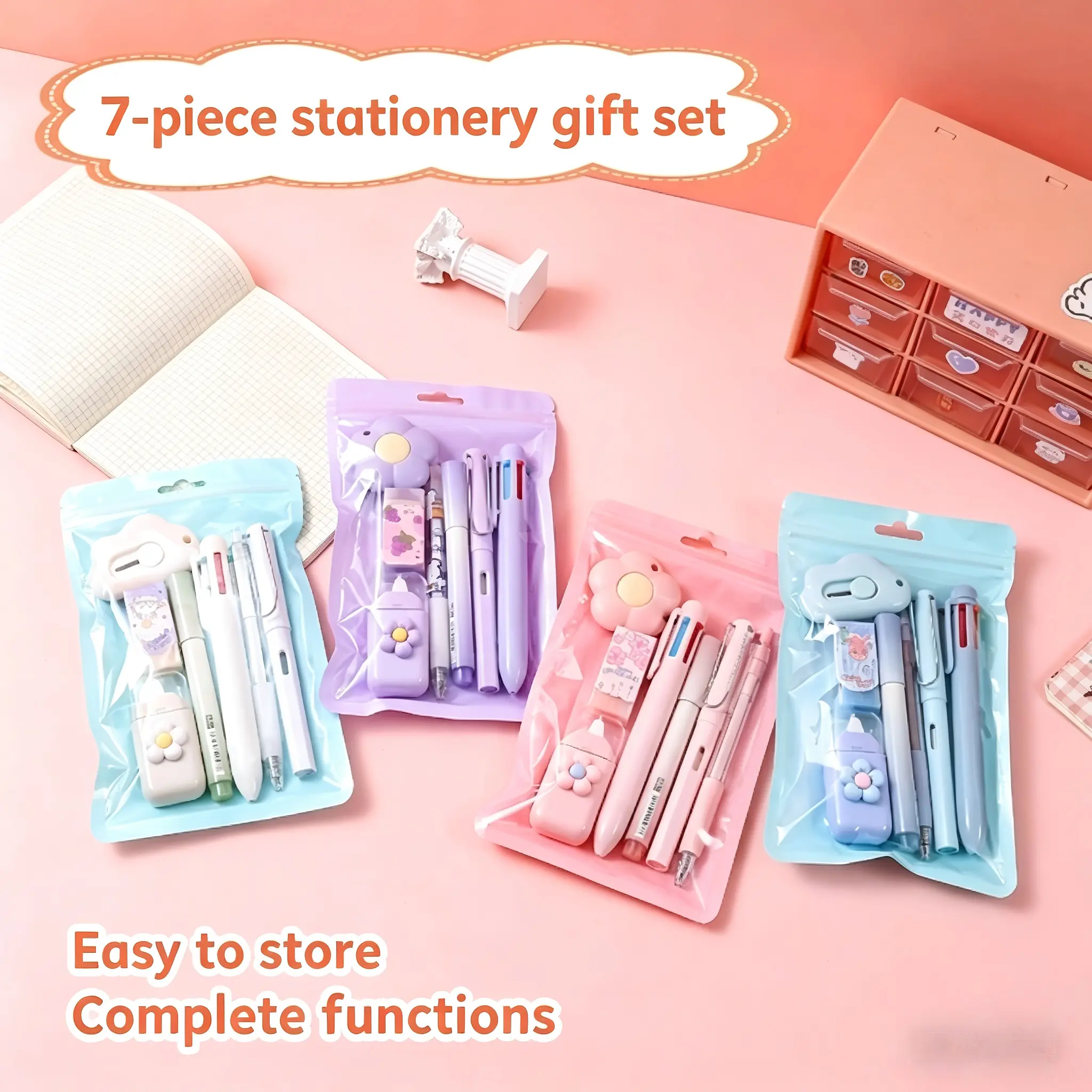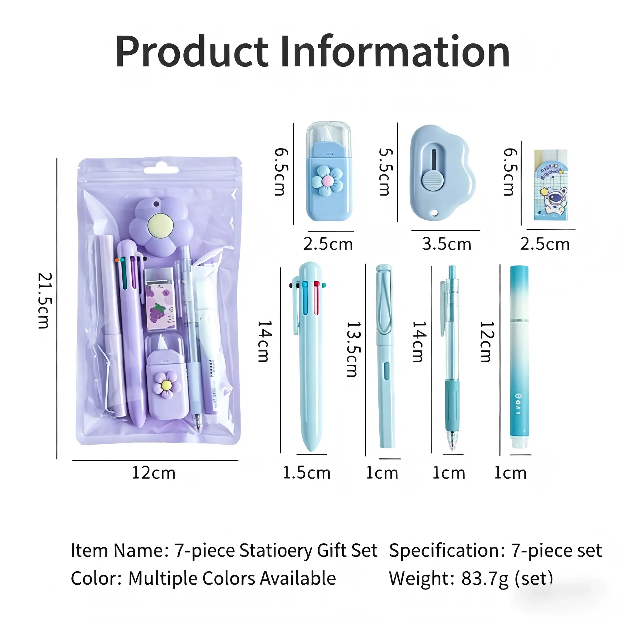7-in-1 Complete Stationery Set: All-in-one kit with gel pen, 6-color ballpoint pen, highlighter, mechanical pencil, correction tape, utility knife, and eraser, meeting all daily study needs.