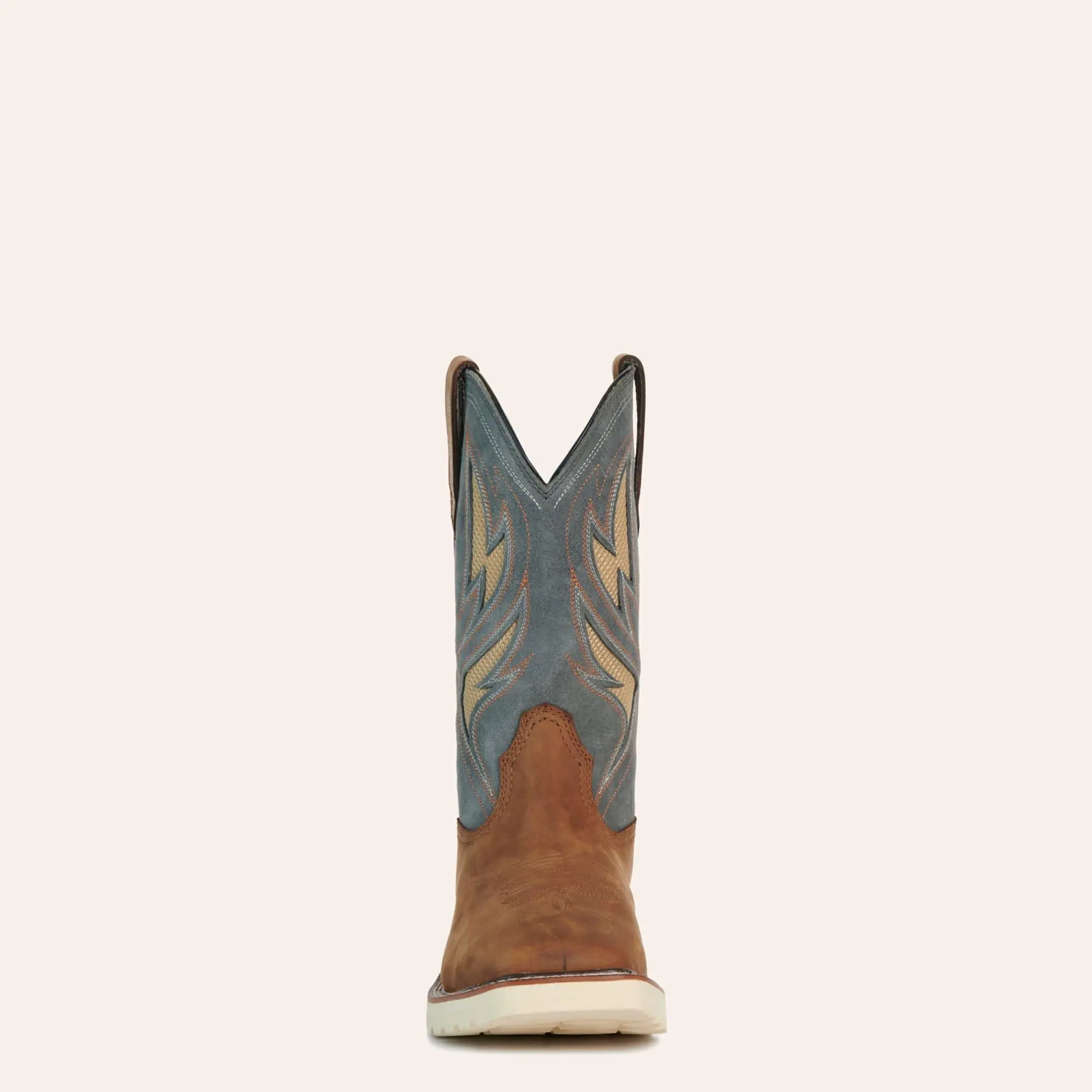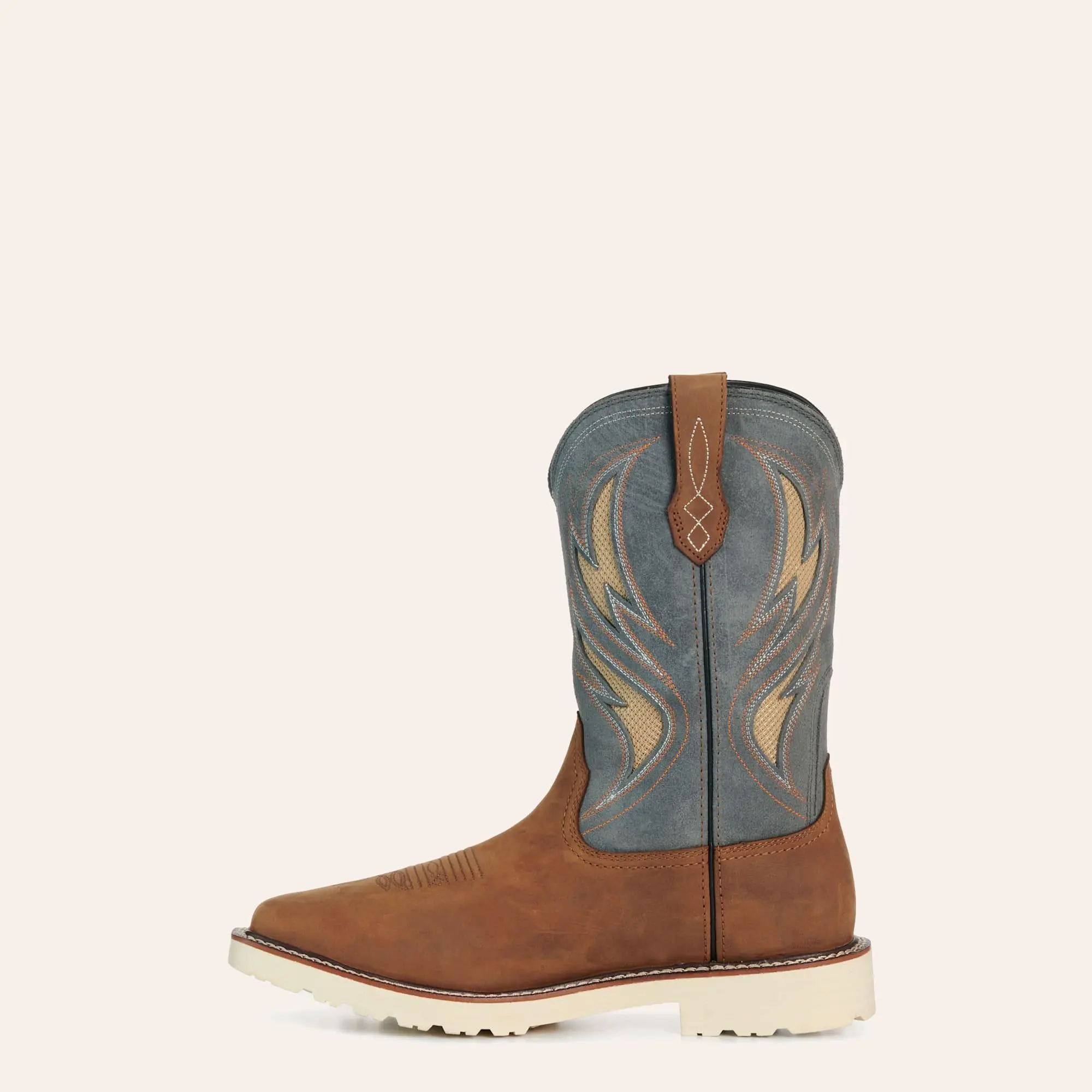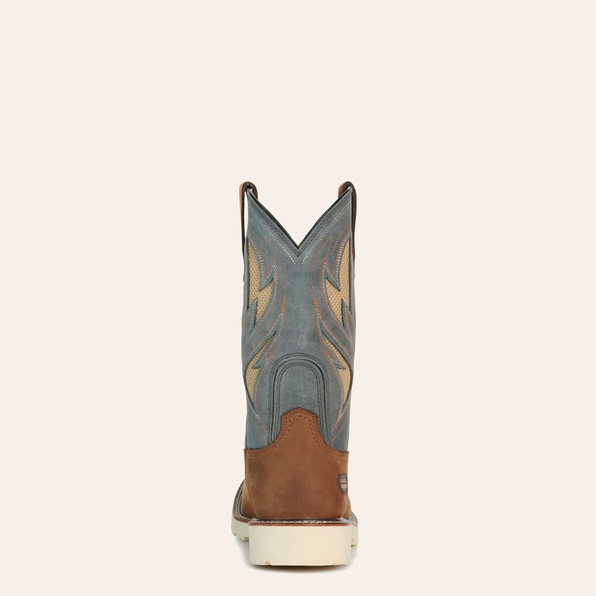 Color: The foot features a rugged Alamo brown tone, giving these boots a timeless Western look. The stone gray shaft with detailed stitching adds contrast and style while maintaining a professional work-ready appearance.