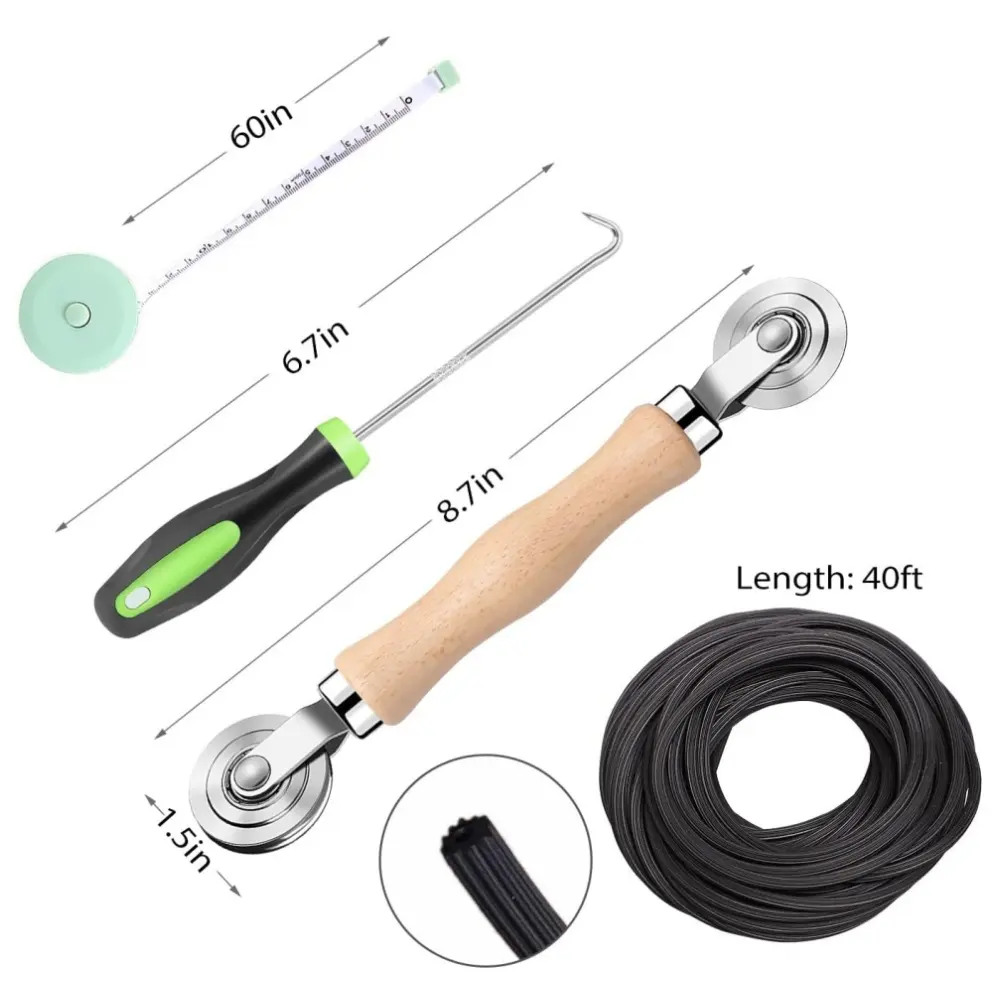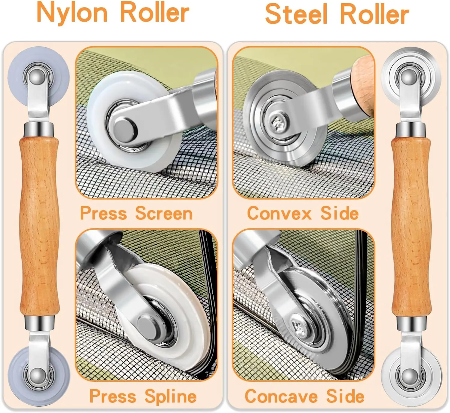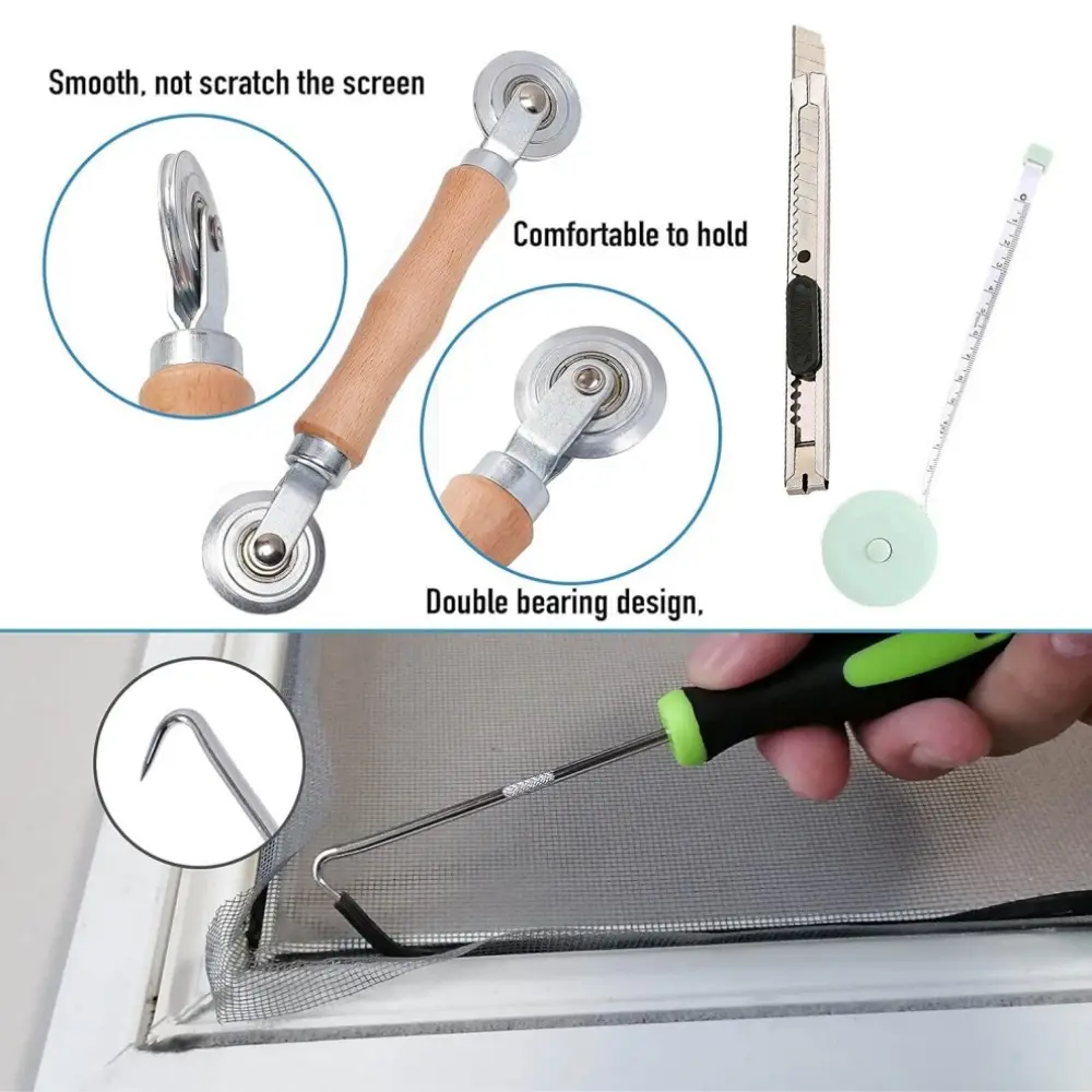 【Perfect screen tool kit】(1)40ft spline for the window screen has high tensile strength; The hollow design is easy to press into the groove but can also supply enough pressure to fix the screen. (2)The screen roller tool material is a solid beechwood handle + double steel bearing metal wheels; the rim is smooth and doesn't scratch the screen. (3)The spline hook makes it easy to move the old spline. (4)A utility knife and measuring tape make it easier and faster to replace the screen windows.