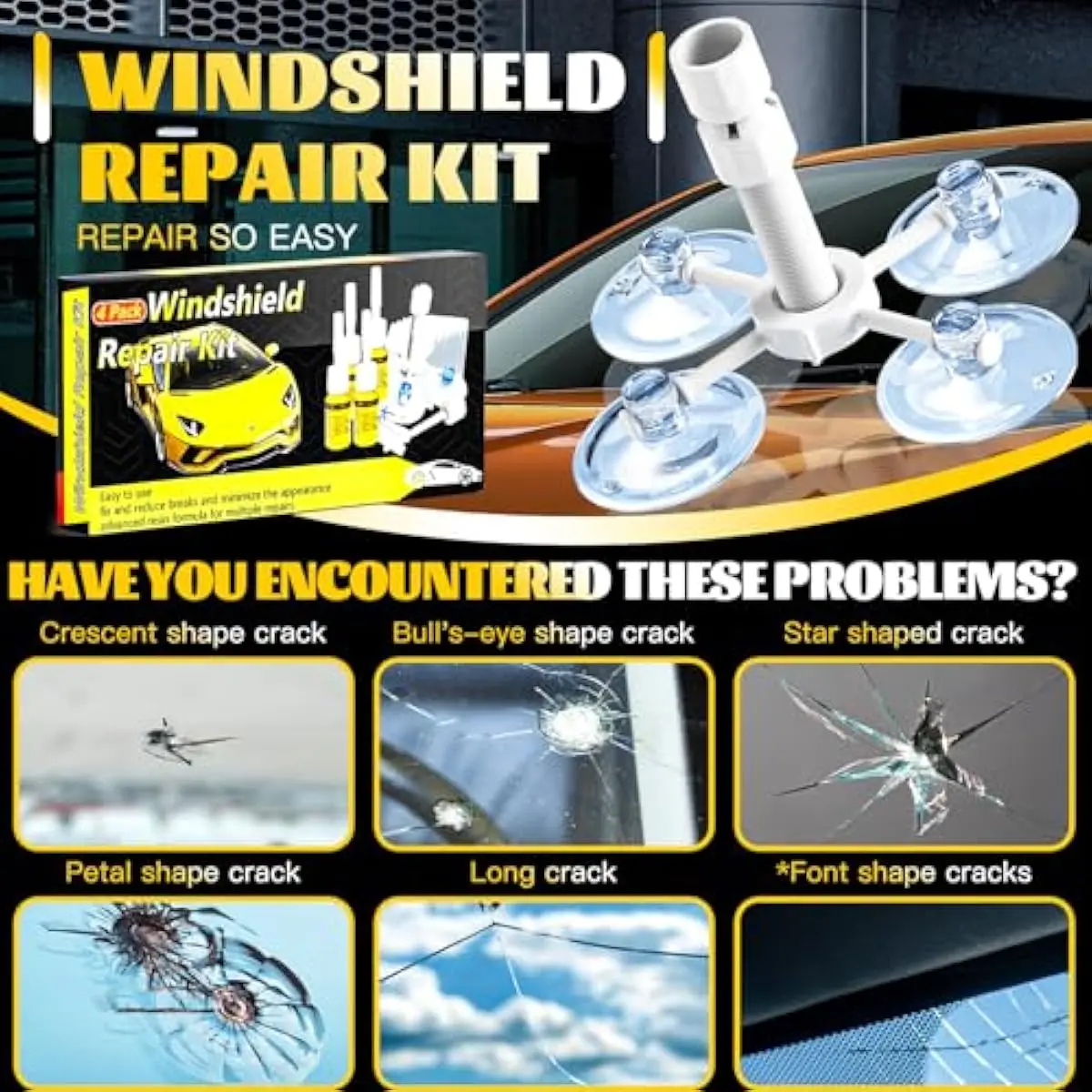 Wide Application: Automotive Windshield Repair Kits are designed to repair all types of laminated windshield shards and cracks such as bugs, cobwebs, bull's eyes, half-moon cracks, star damage, and cracks smaller than 12"/30cm and Spherical lesions less than 1 inch in diameter were the best candidates for this group.