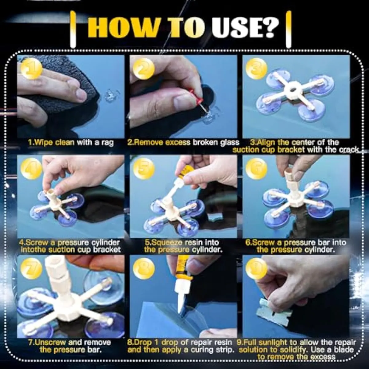 Quickly Repair: When you use the window crack repair kit, first clean and dry the glass surface, then squeeze the resin into the crack, apply the curing film, then place the car in the scorching sun or use a UV curing lamp, dry, and bond the car for 5-20 minutes, and remove with a scraper, residual glass repair solution.