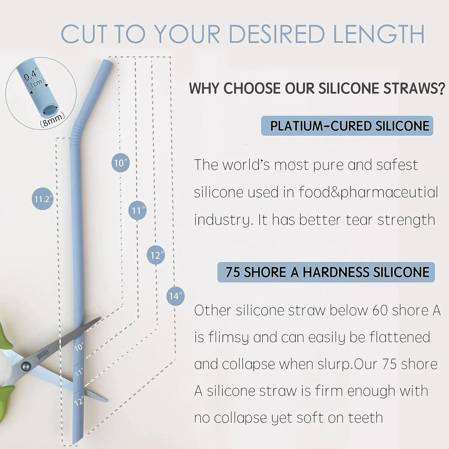 ·2.75 Shore A Hardness Silicone: silicone straws below 60 shore A is flimsy and can easily be collapsed when slurp. Our 75 shore A silicone straws is strong enough not to collapse no matter how hard you slurp yet soft on the teeth
