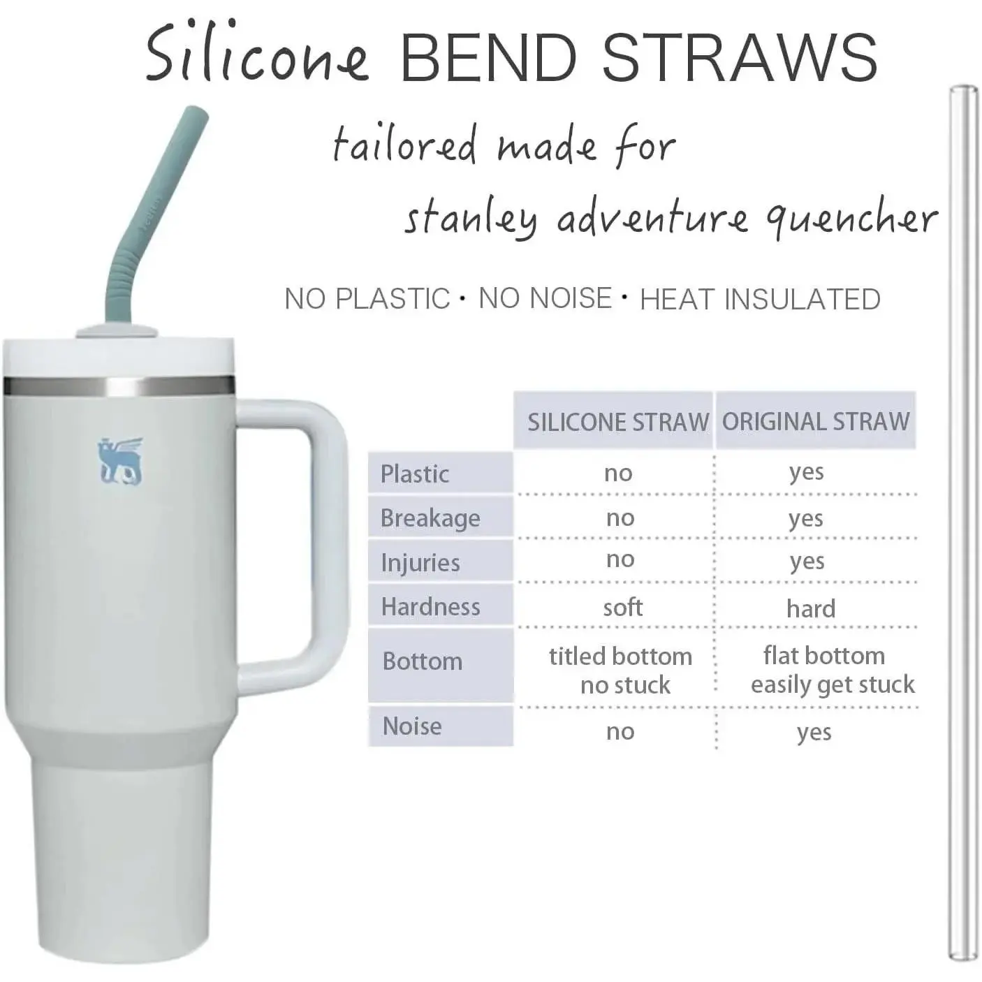 ·1.Designed for 40/30 oz tumbler: 14.5 Inch Replacement silicone bent straw with matched removable cover is tailored made for stanley owala 30/40 oz cups/tumblers.Comes with 2 longer bendable brushes for through cleaning