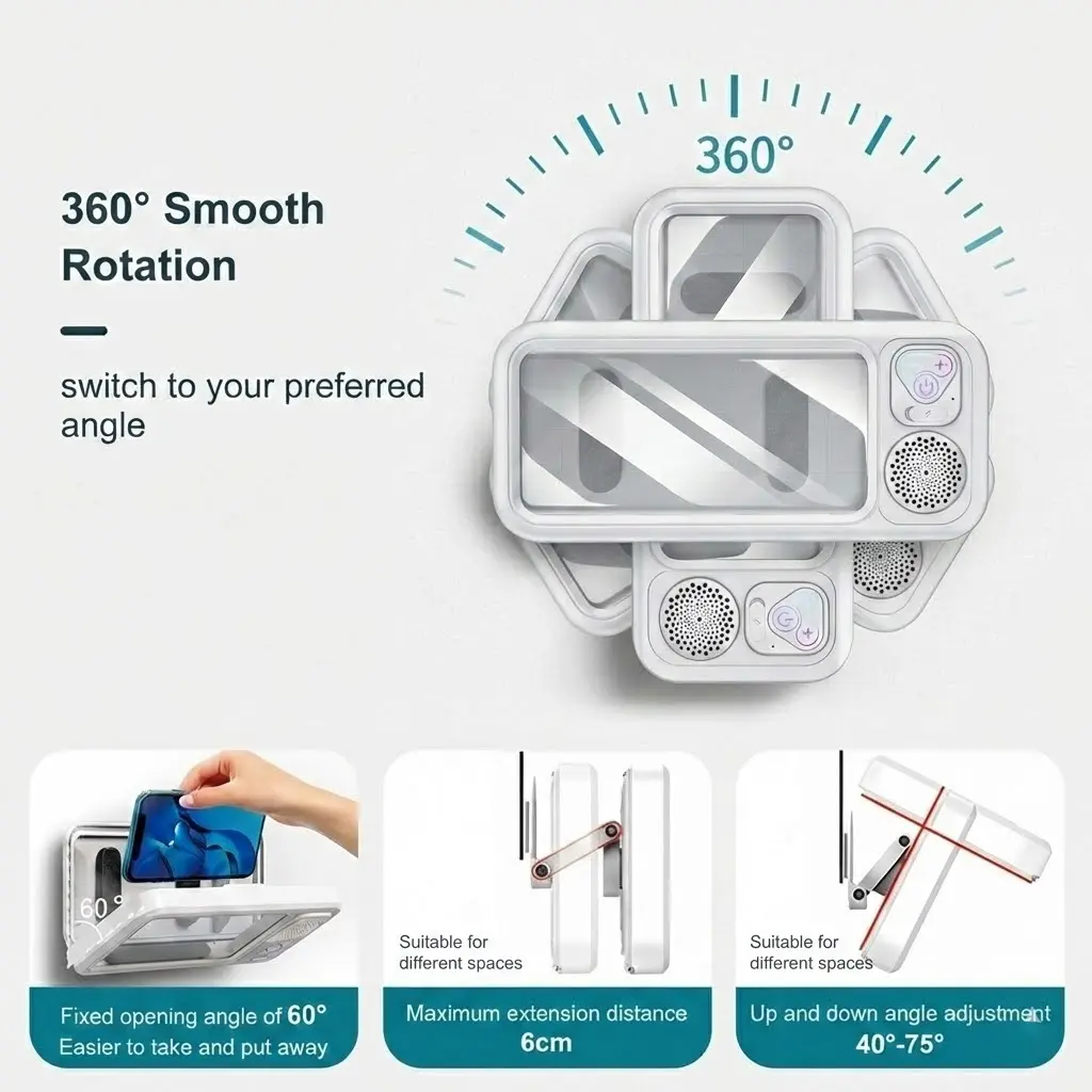 Shower Wall Mount Phone Case with Bluetooth Speaker, IPX7 Waterproof Touch Screen 360° Rotation Phone Holder for Bathroom