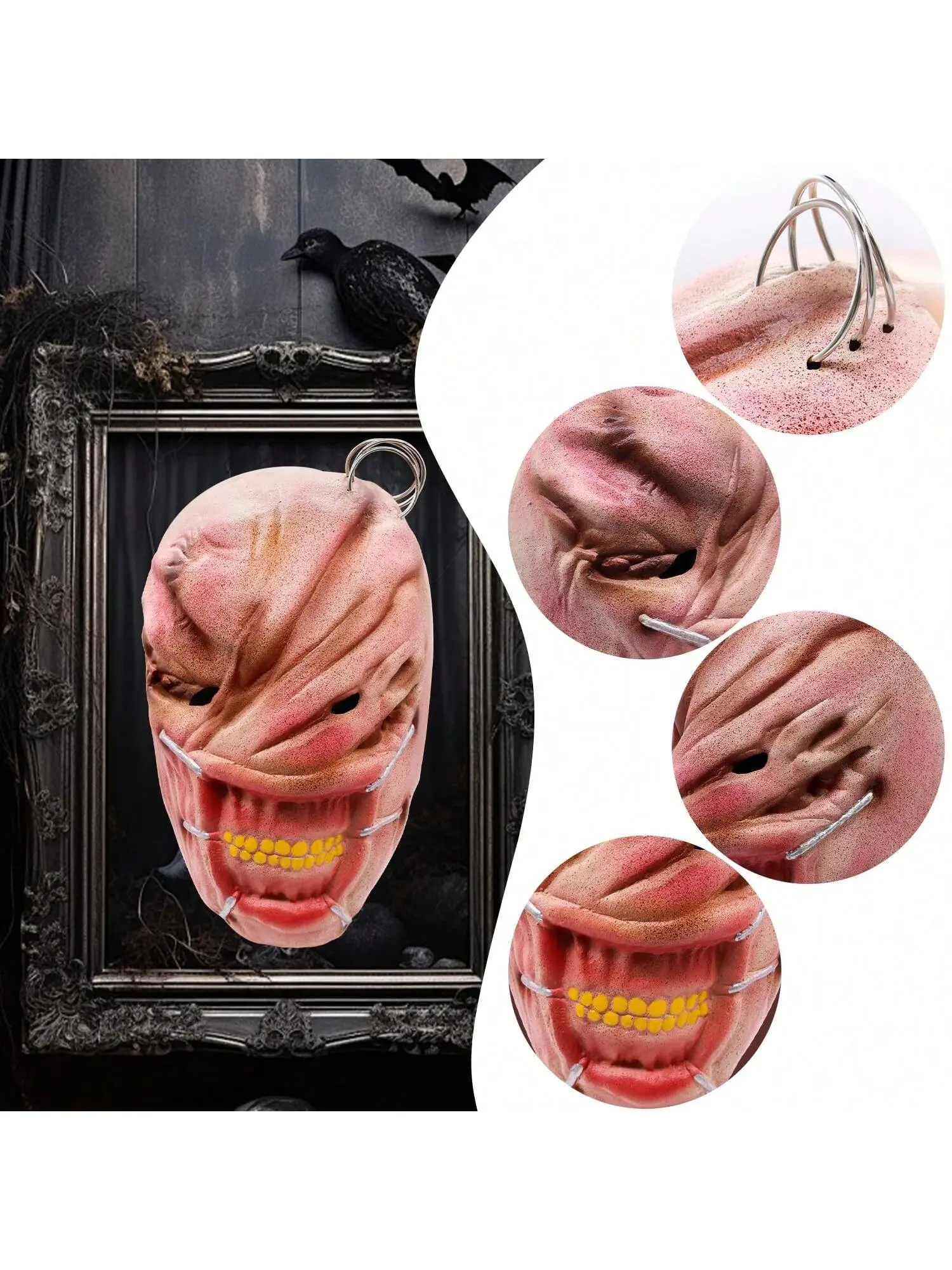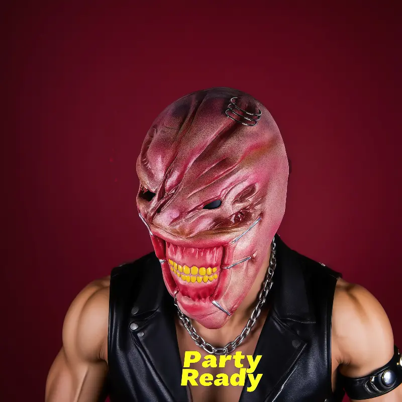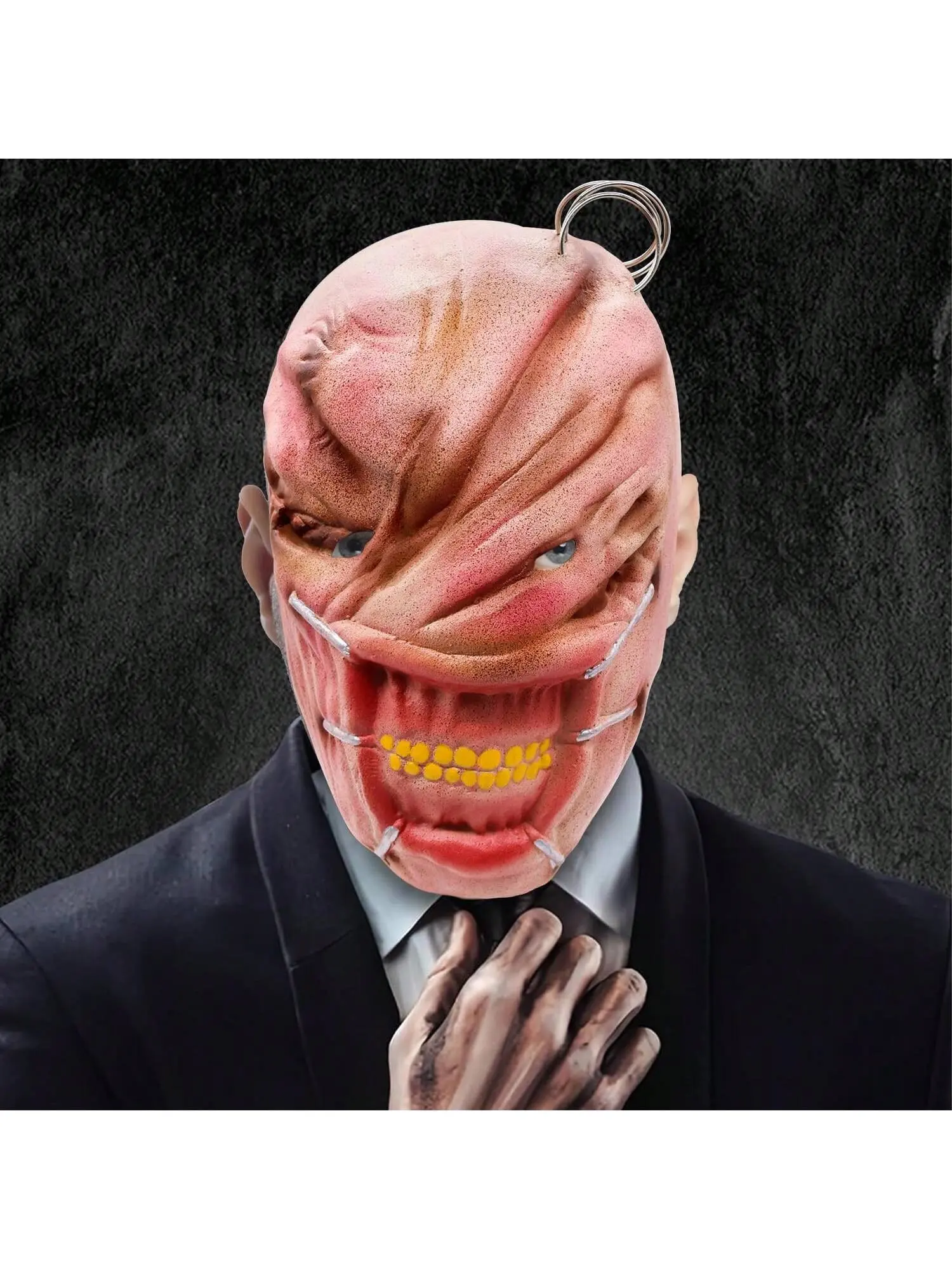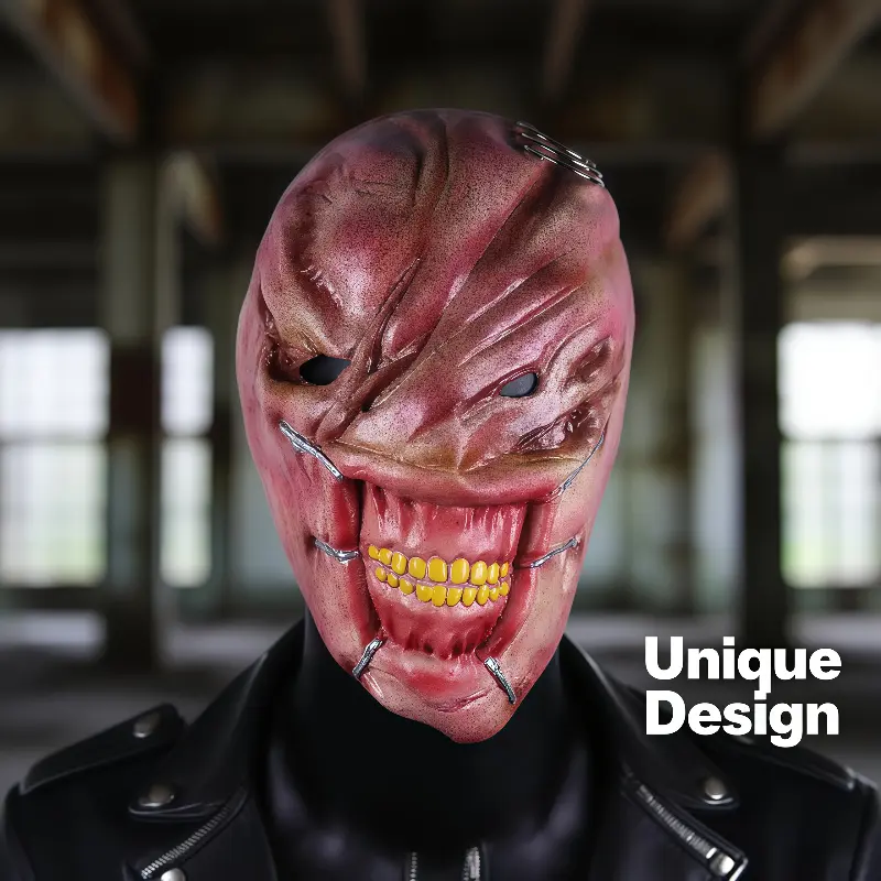 This full latex mask is based on the classic horror stitched monster concept, crafted with highly realistic techniques: a flesh pink aged body, deep twisted skin wrinkles, silver metal stitching scars (covering the forehead and corners of the mouth), yellowed serrated teeth within the large mouth, paired with metal wire decoration at the top of the head—every detail meticulously realized to perfectly recreate the monstrous appearance of the horror subject. Upon wearing, it instantly transforms into a "terrifying monster." Whether it’s Halloween horror styling or haunted house NPCs, it instantly creates an extreme scary atmosphere and becomes the center of attention!