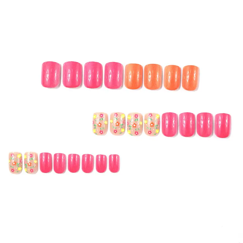 Summer Vibrancy Flower Patch Nails Set, 24 short oval faux nails with glossy surface, featuring bright and colorful floral decorations. They fit comfortably and stay fixed for a long time. Suitable for daily and formal occasions. elegant pink minimalist