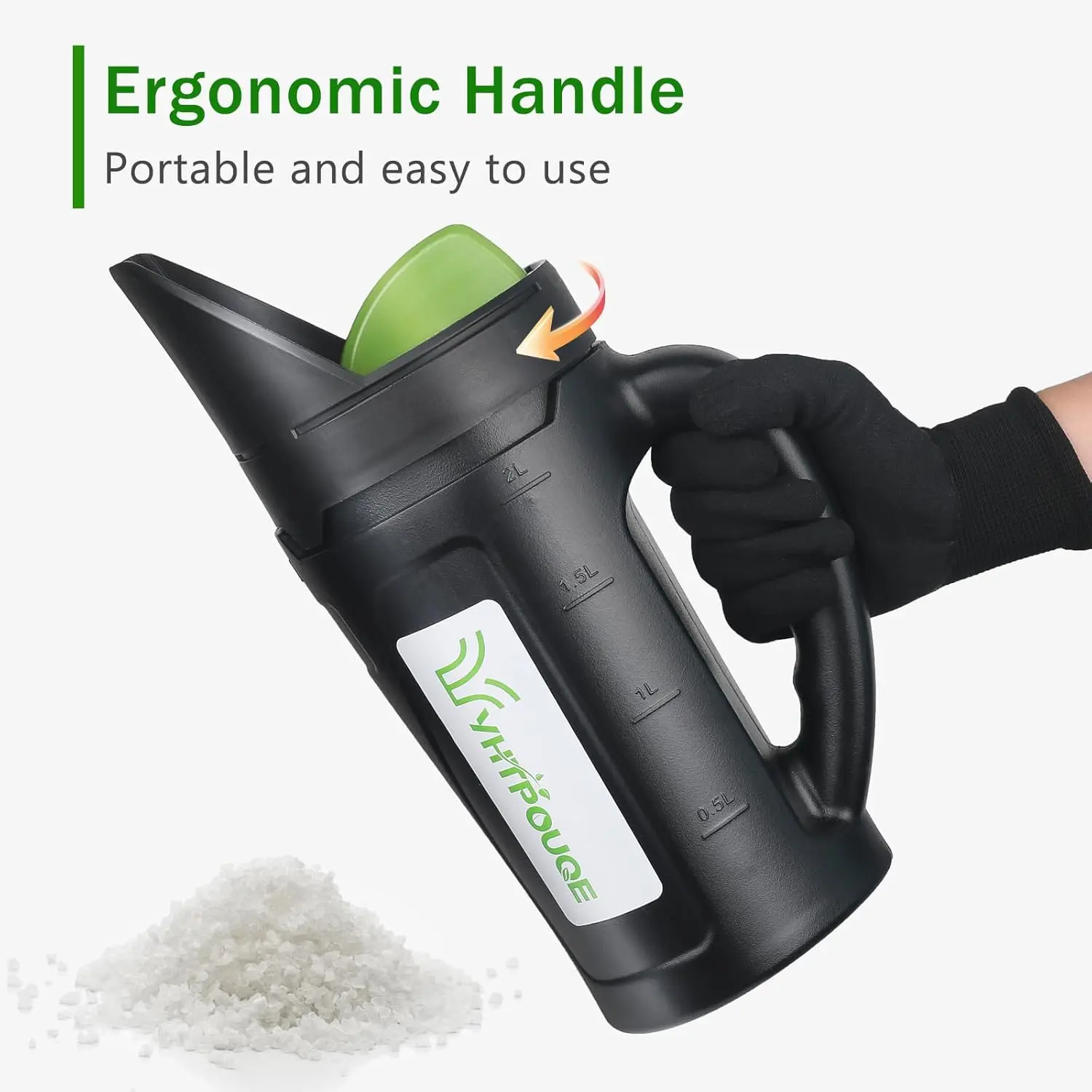 ·3-setting handheld spreader, with its generous 2.5L capacity, is your essential partner for every season. It comes ready for action, paired with a protective glove and a handy scoop for easy filling. Revitalize your lawn in spring and summer, then confidently face winter as a powerful salt spreader for snow on your garden paths, patio, and pathways.