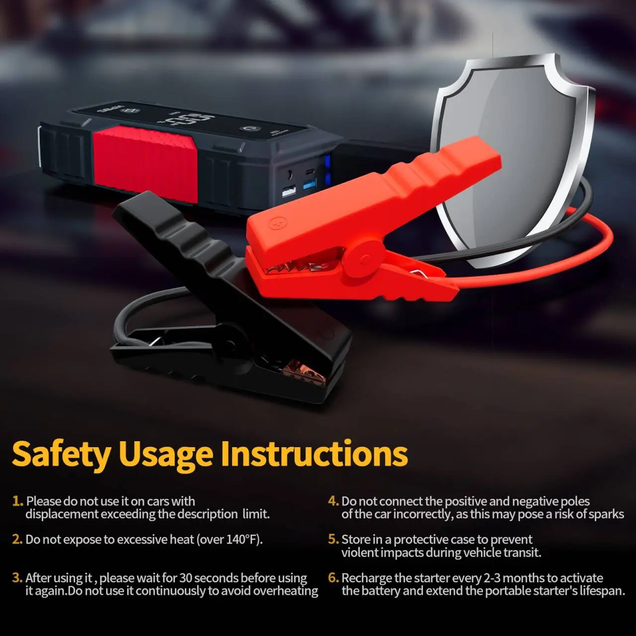 【NOTE】Do not expose to excessive heat (over 140°F). Store in a protective case to prevent violent impacts during vehicle transit. Fully charge the starter upon initial receipt; it is recommended to start the vehicle when the battery level is above 75%. Recharge the starter every 2-3 months to activate the battery and extend the portable starter's lifespan.