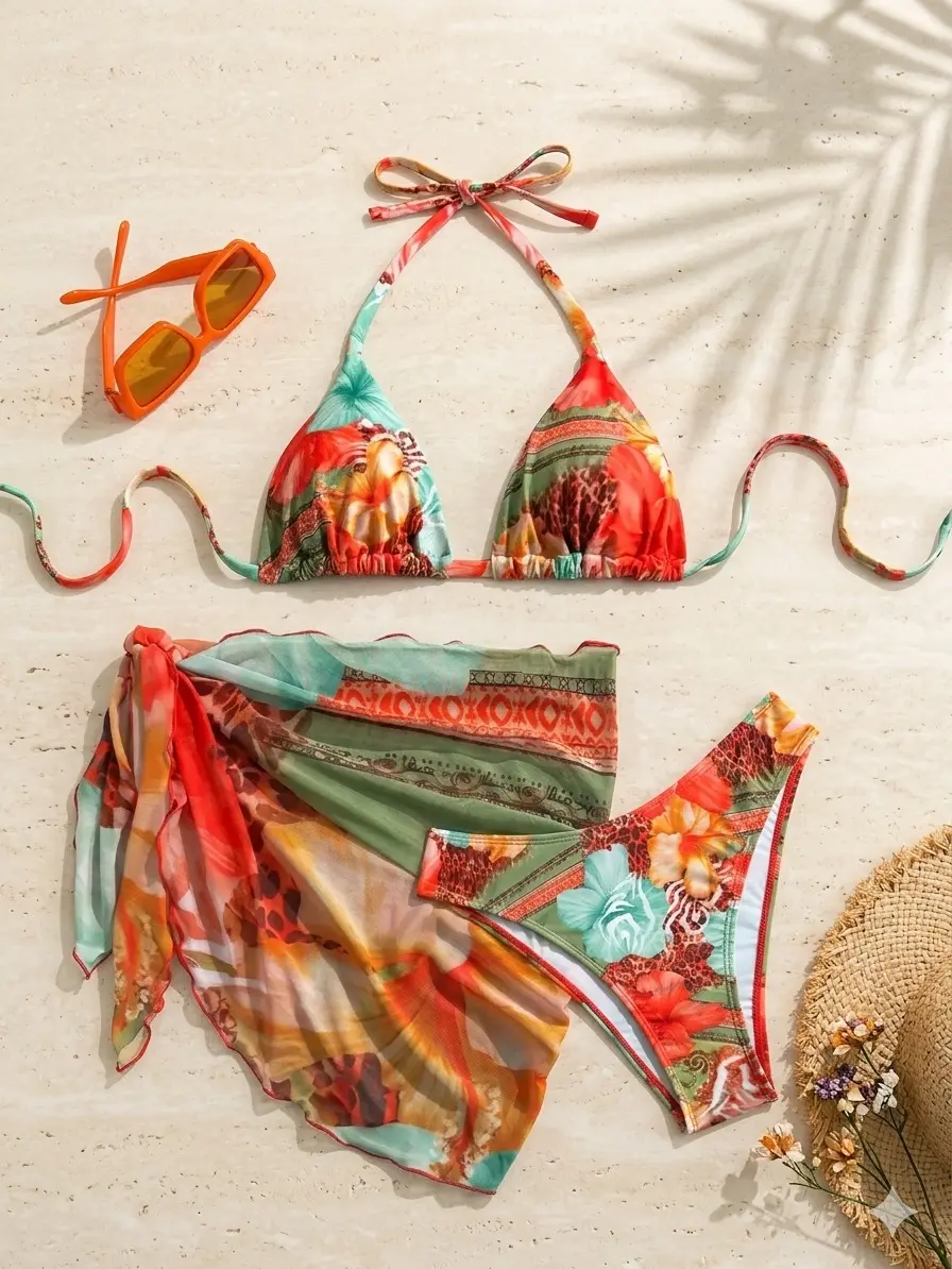 Three-Piece Set Women's All Over Print Bikinis Set, Ruffle Trim Halter Tie Back Triangle Bikini Top & Thong & Sheer Tie Side Cover Up Skirt Swimwear Set for Beach, Women's Swimsuit for Summer, Floral Print Bikinis, Flower Print Bikini, Bikini Sets