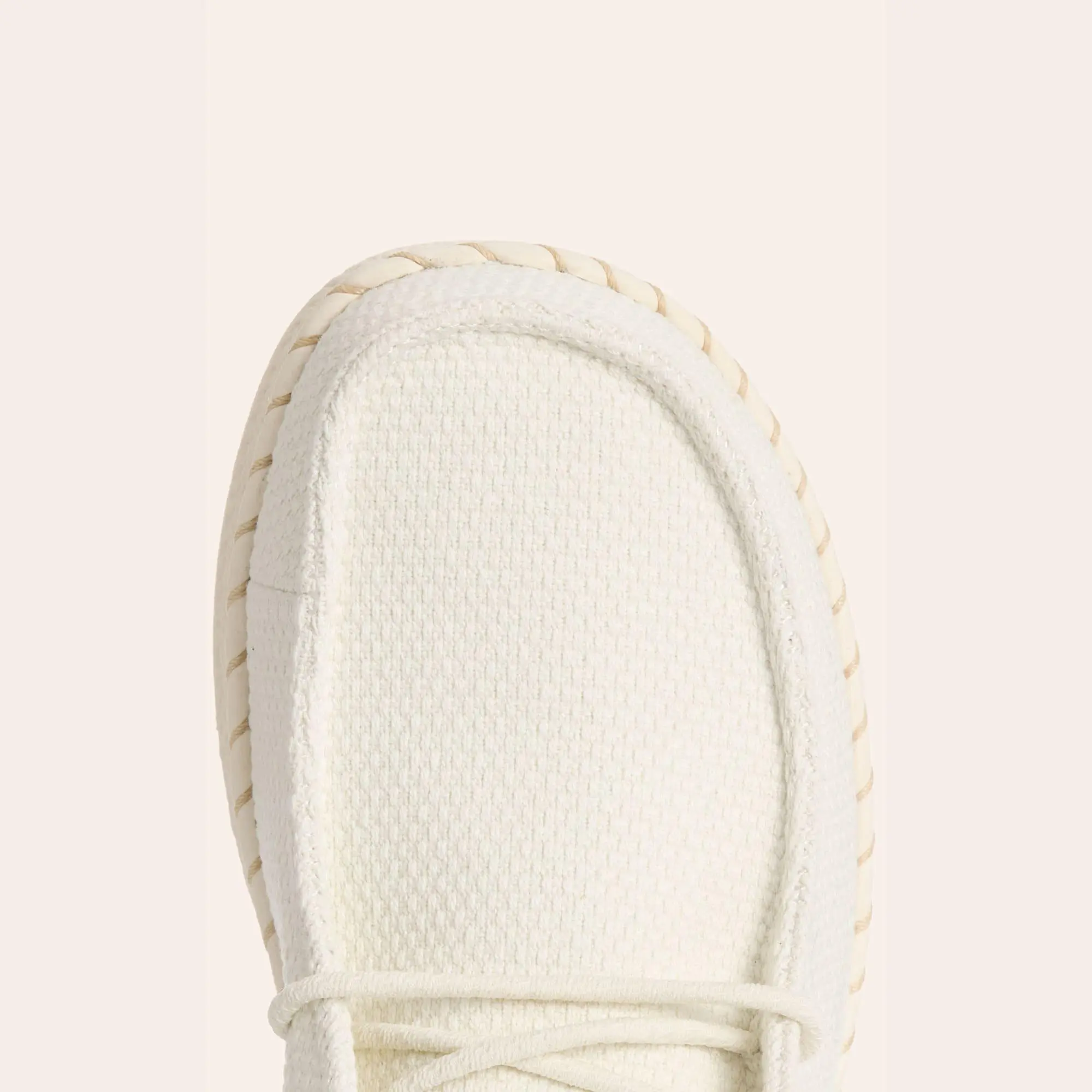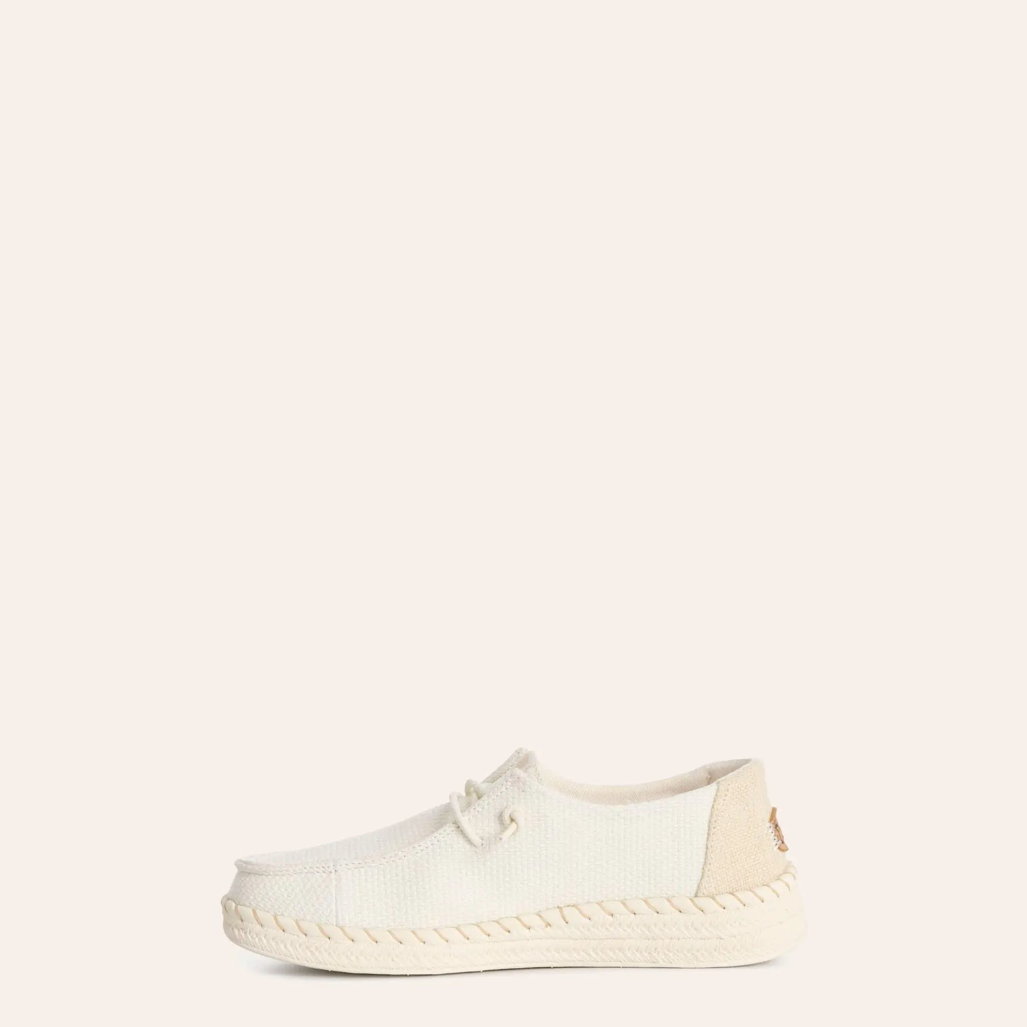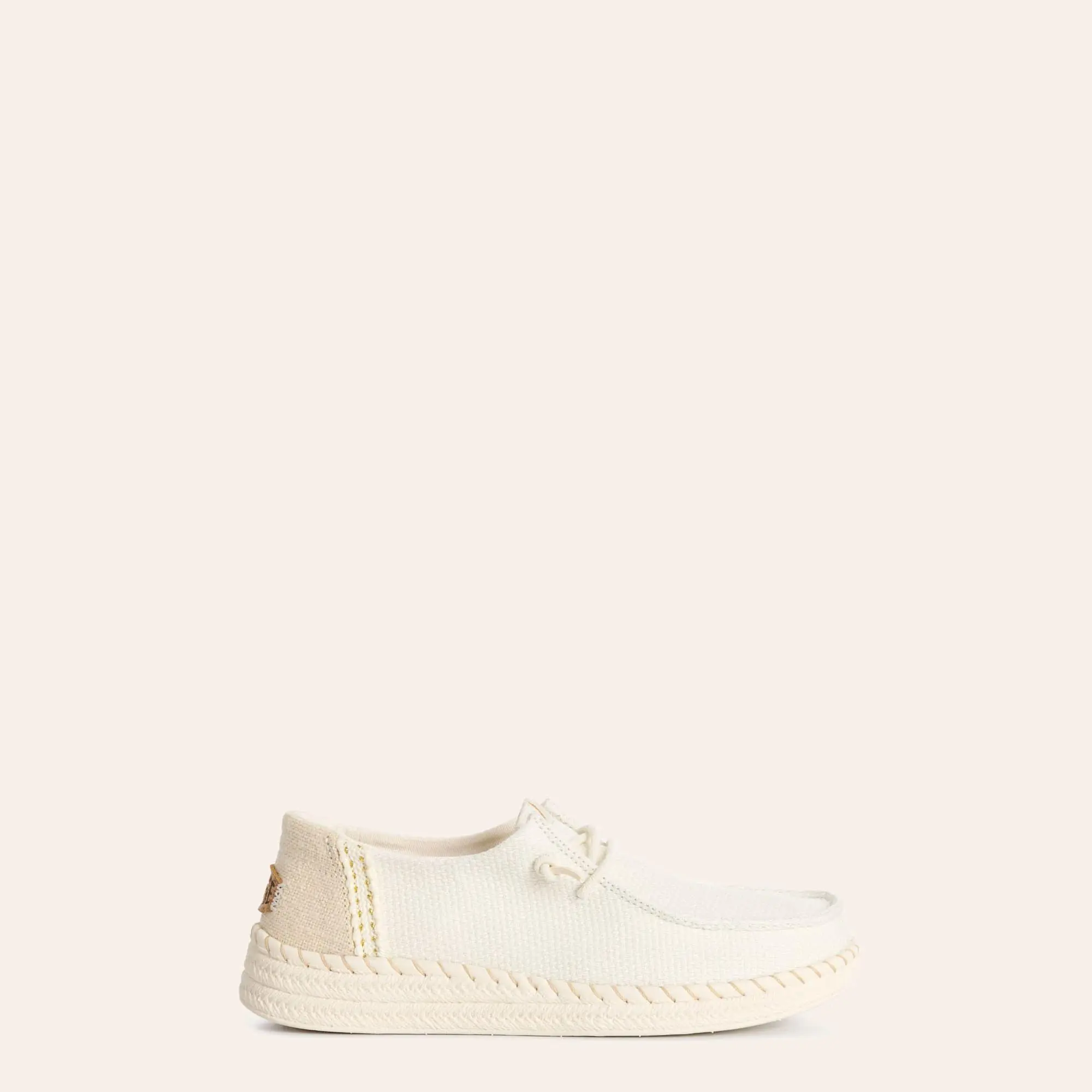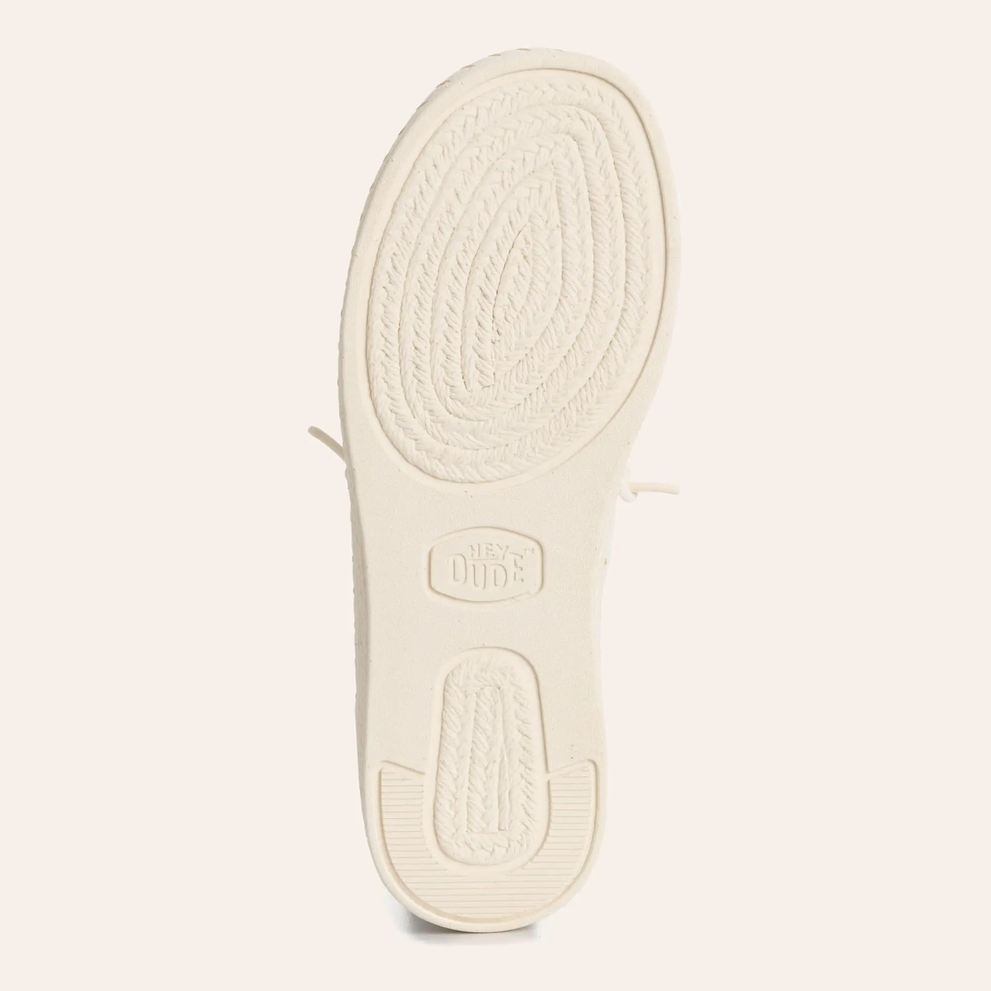 Elevate your casual Western wardrobe with the Hey Dude women’s Wendy white espadrille woven casual shoes. Lightweight and breathable, these moc toe shoes blend effortless comfort with a breezy, coastal vibe. They feature a clean, textured white upper with eye-catching gold whipstitching at the heel, adding a subtle pop of personality. Offering all-day comfort, these women’s slip-on casual shoes come with a flexible fit and cushioned insole. Hey Dude’s comfort technology is unmatched, and their Wendy women’s shoes remain true to the brand’s signature look and feel.