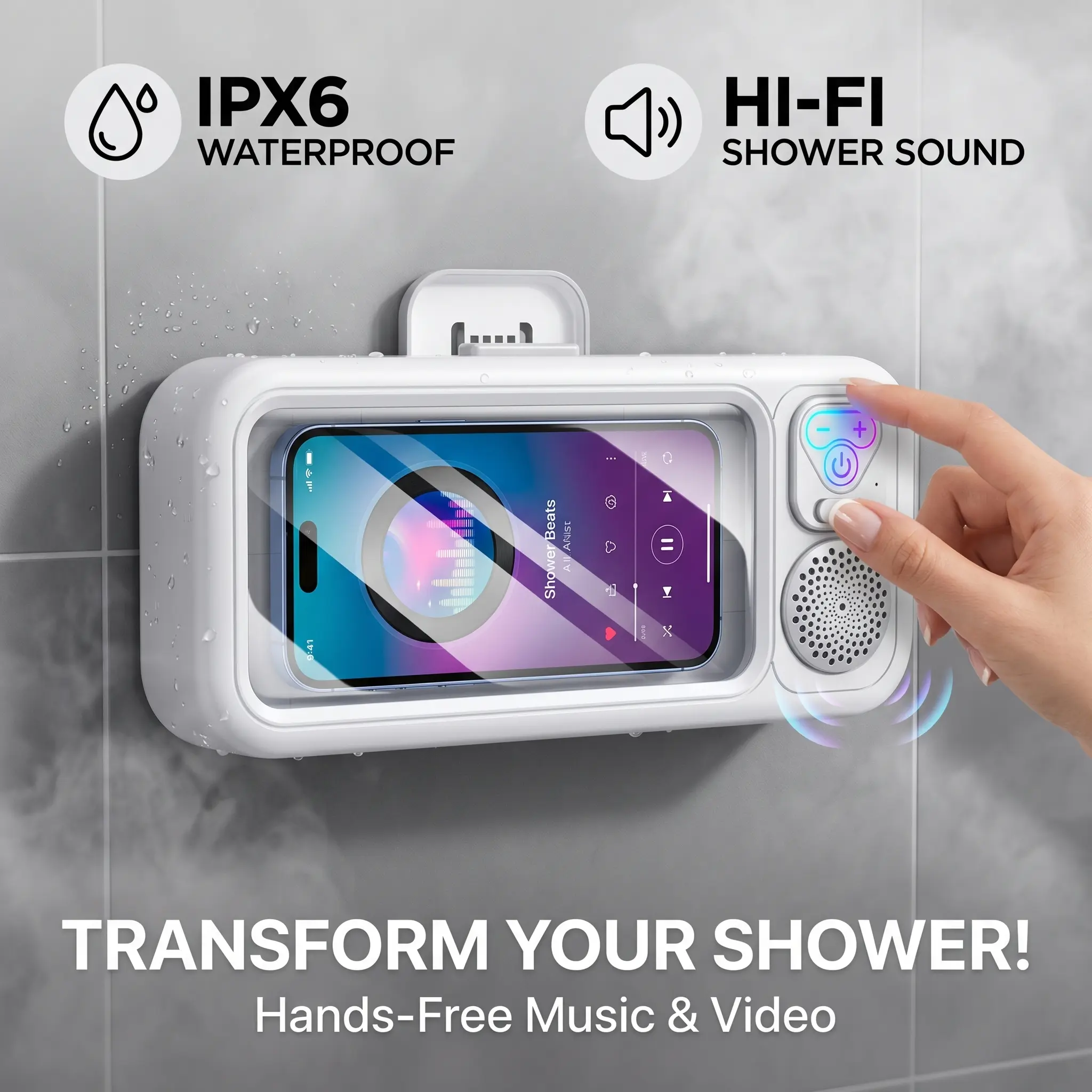 Waterproof Shower Phone Holder with Bluetooth Speaker & 360° Rotation, Touch Screen Wall Mount Stand for Bathroom