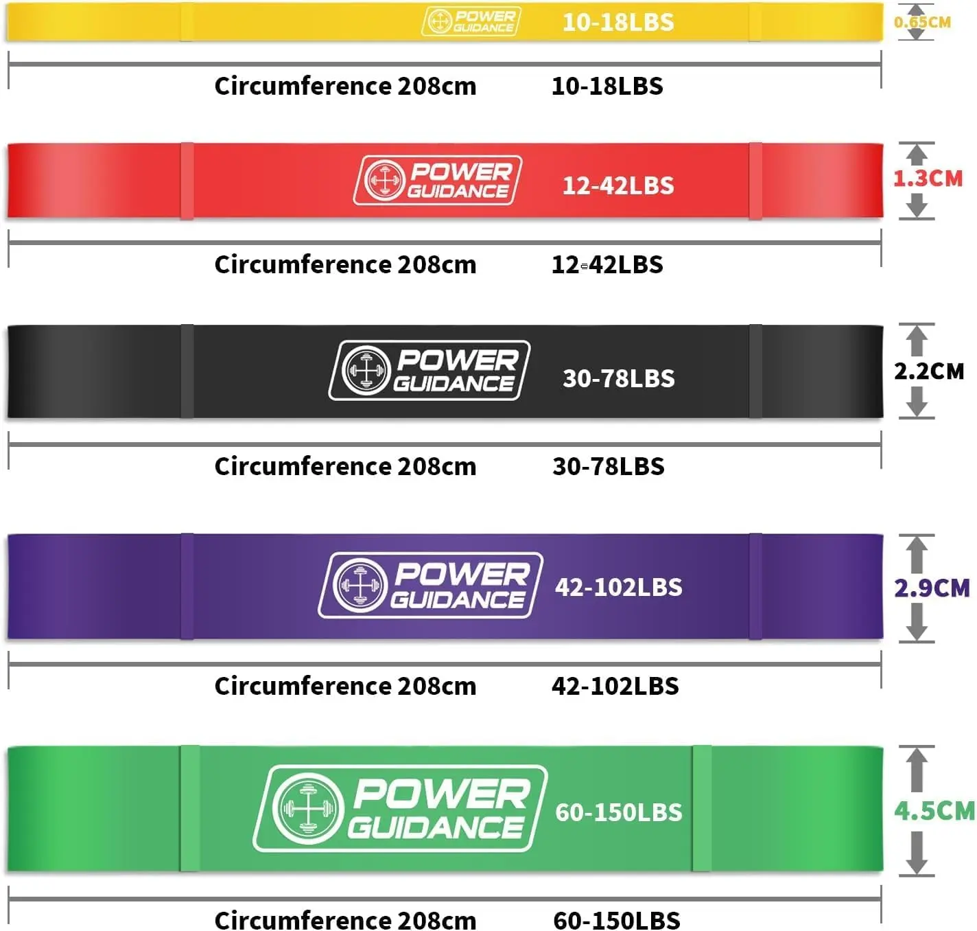 ·Five pound sizes:POWER GUIDANCE exercise bands with 5 levels of resistance, ranging from Ultralight (Yellow) / 10-18 lbs to Super Strong (Green) / 60-150 lbs. Perfect for any fitness level, these workout bands help increase flexibility, build strength, and improve physical performance.
