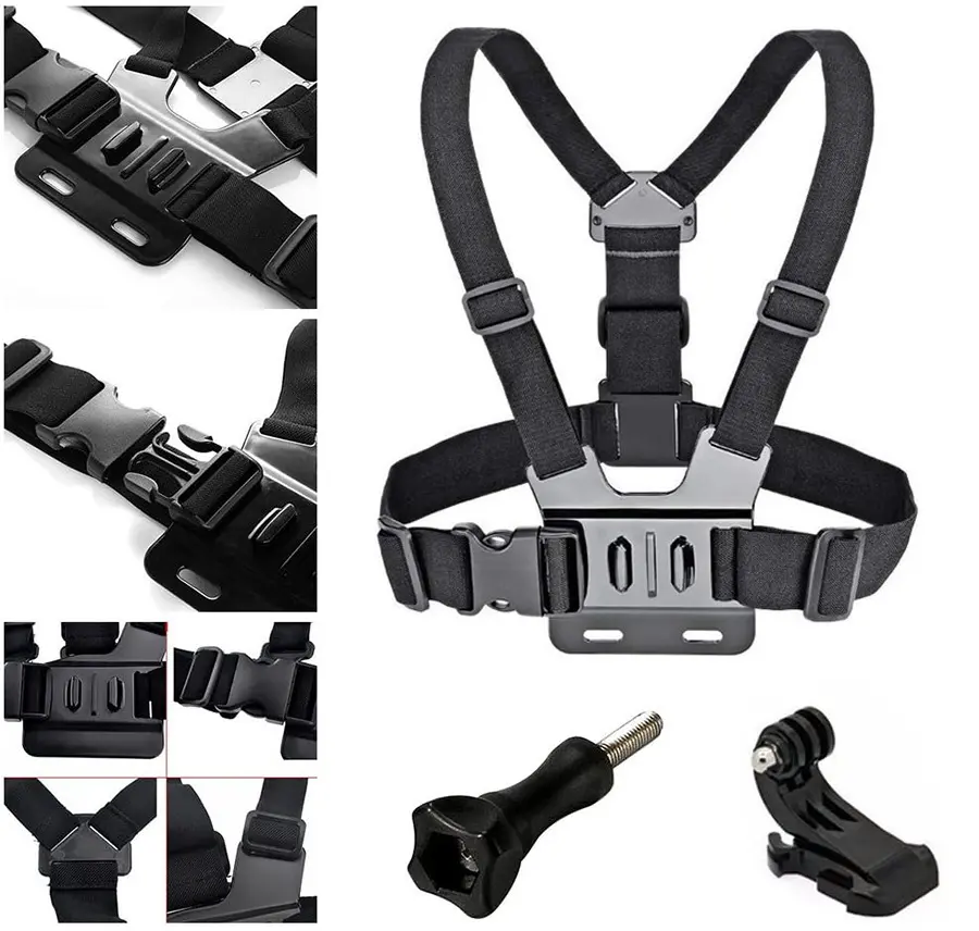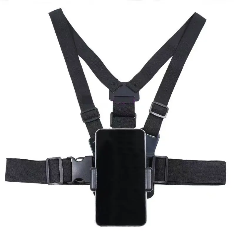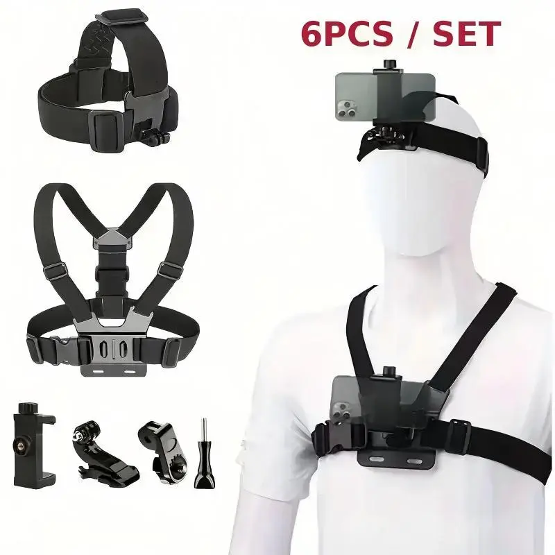 6-in-1 chest-mounted phone holder kit, suitable for sports and action cameras; adjustable strap; compatible with phones and Osmo action cameras; includes camera accessories and device mounts; hands-free first-person shooting; ideal for vlogging, cycling,