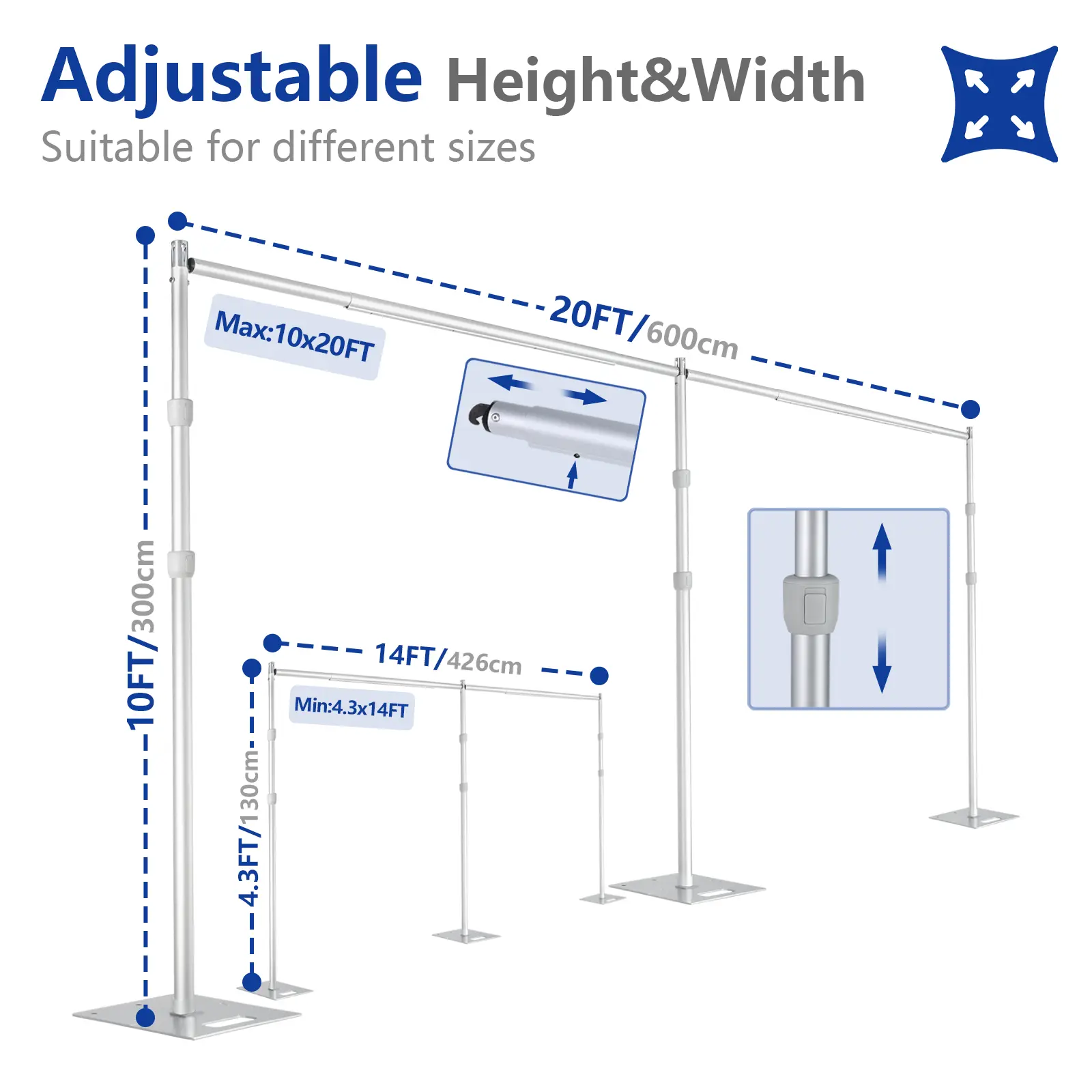 ·Adjustable Backdrop Stand:10x20ft Pipe and drape stand flexible adjust height during 4.5ft to 10ft, wide during 7ft to 10ft, can easily set up diffrent size for different backdrop size