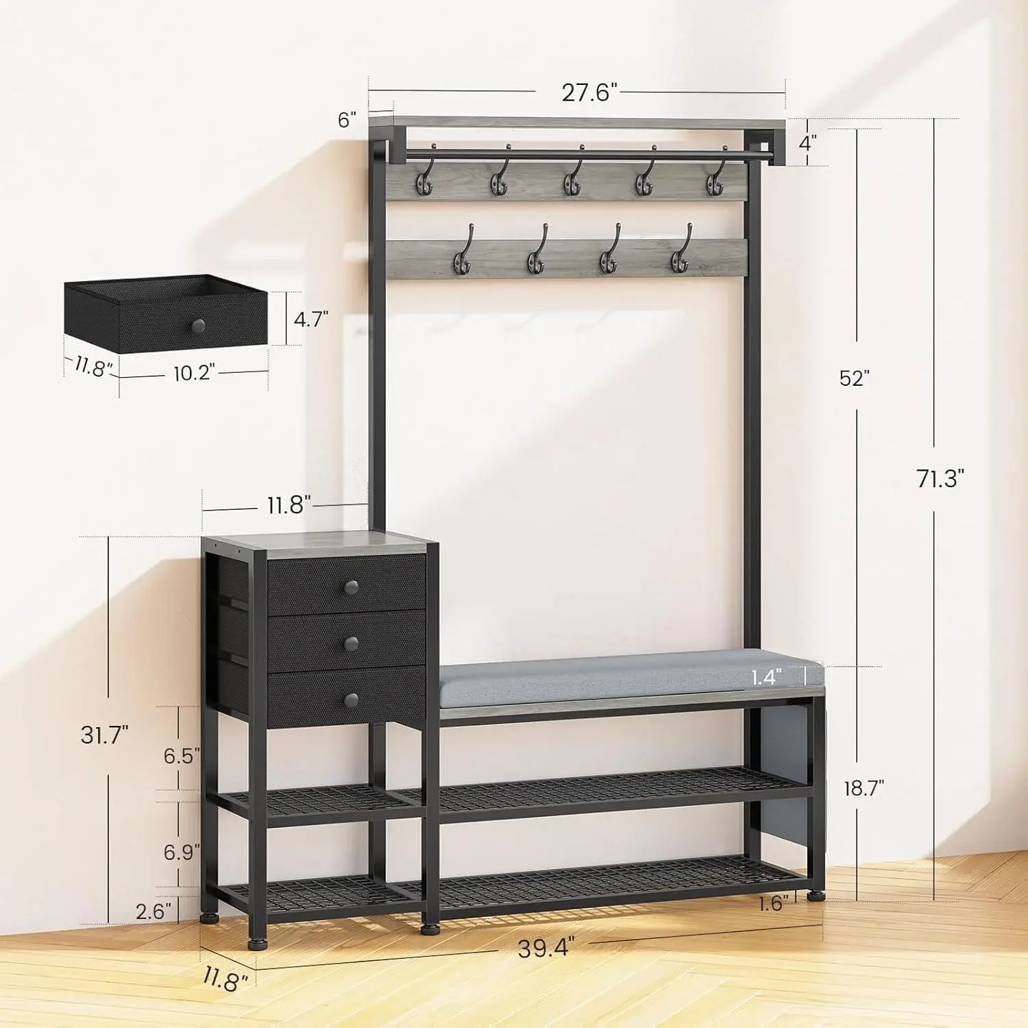 Transform your entryway into a stylish and organized space with this versatile 5-in-1 Entryway Hall Tree. Designed to combine functionality and modern aesthetics, this hall tree makes your busy mornings hassle-free by keeping all your essentials in one spot. Its classic grey finish seamlessly complements any home décor, making it a perfect addition to your entryway, hallway, or mudroom.