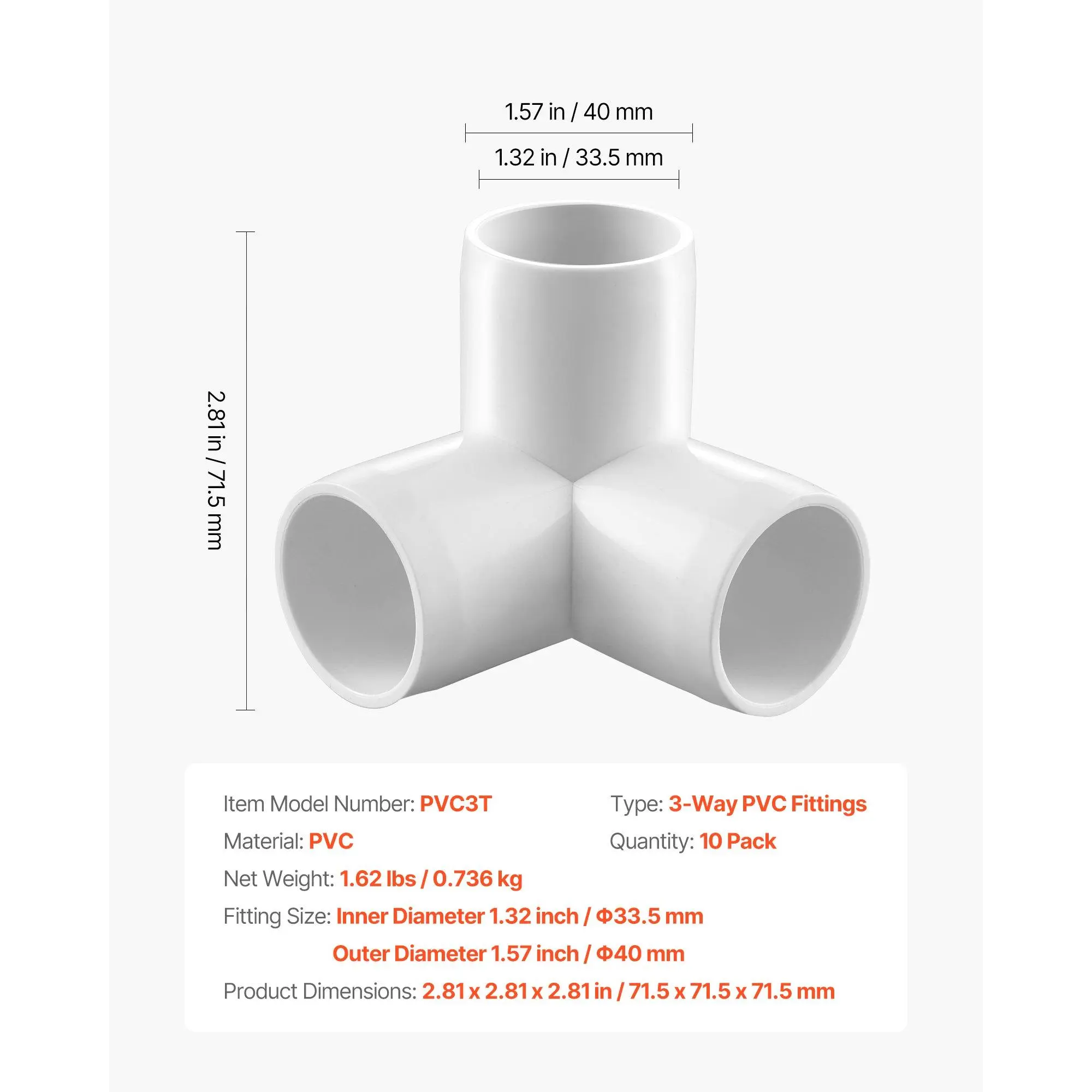 Our 3-way PVC fittings fit 1-inch PVC pipes, providing a durable, secure connection that stands up to wear, corrosion, low temperature and sun exposure. Perfect for a wide range of DIY projects like storage frames, shoe racks, and animal cages. Inner Diameter: 1.32 inch, Outer Diameter: 1.57 inch.