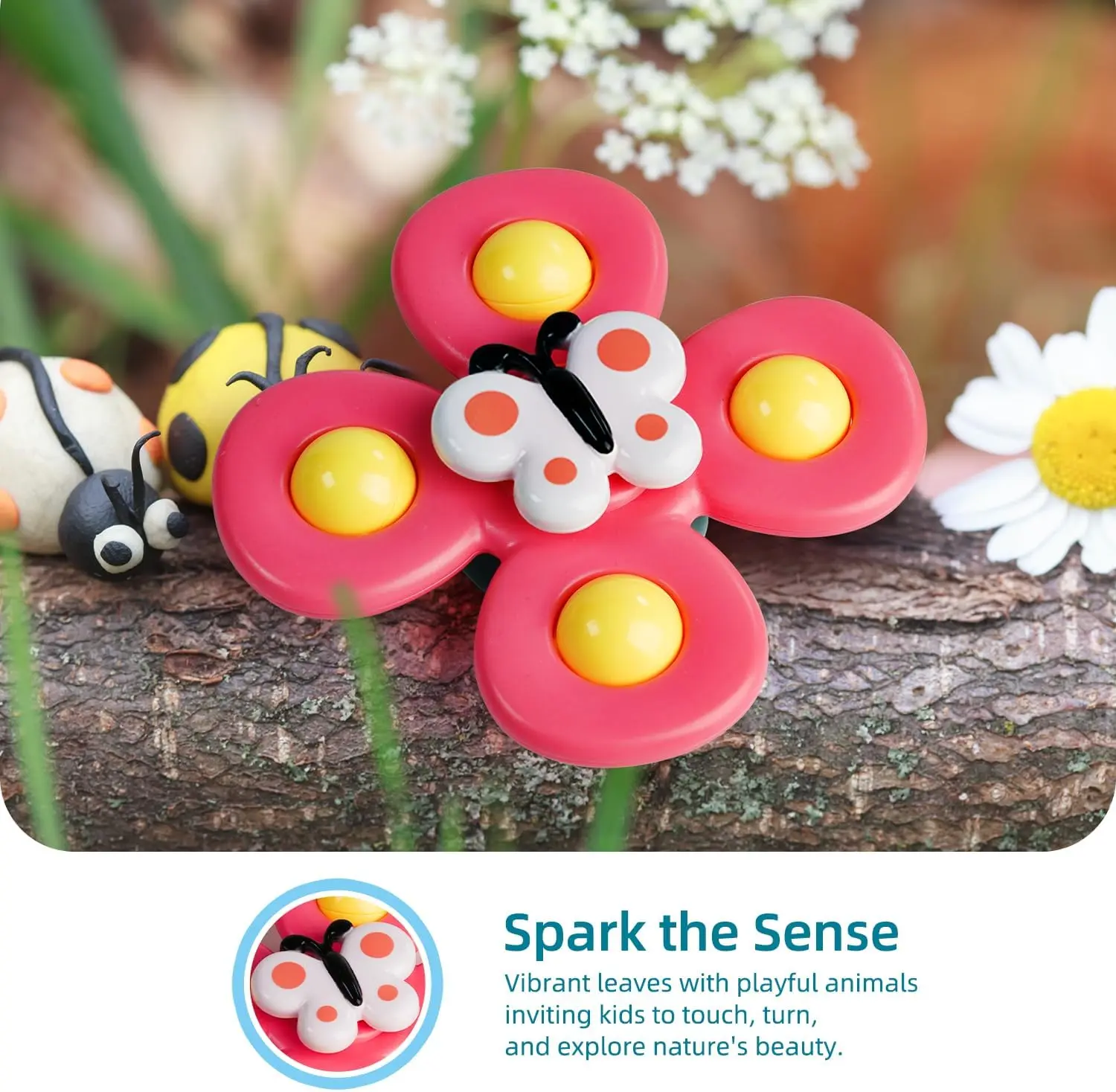 ·Spark the Sense: Vibrant flowers with playful insects, inviting kids to touch, turn, and explore nature's beauty