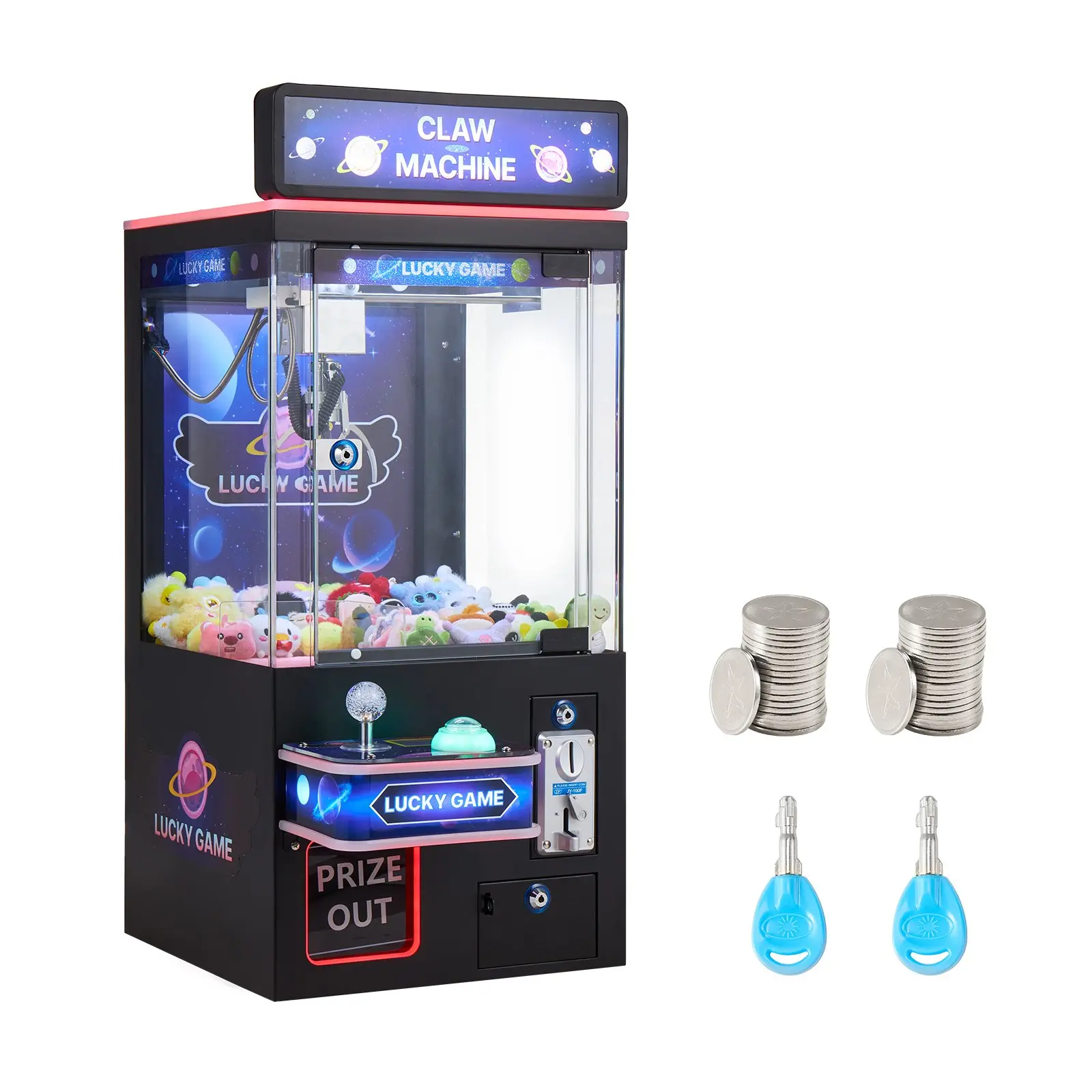 Insert coins to start the game. The claw crane machine features an adjustable precision steel claw for toys from mini figurines to large collectibles. Smooth play improves accuracy, and a wider prize slot avoids jams for easier retrieval.