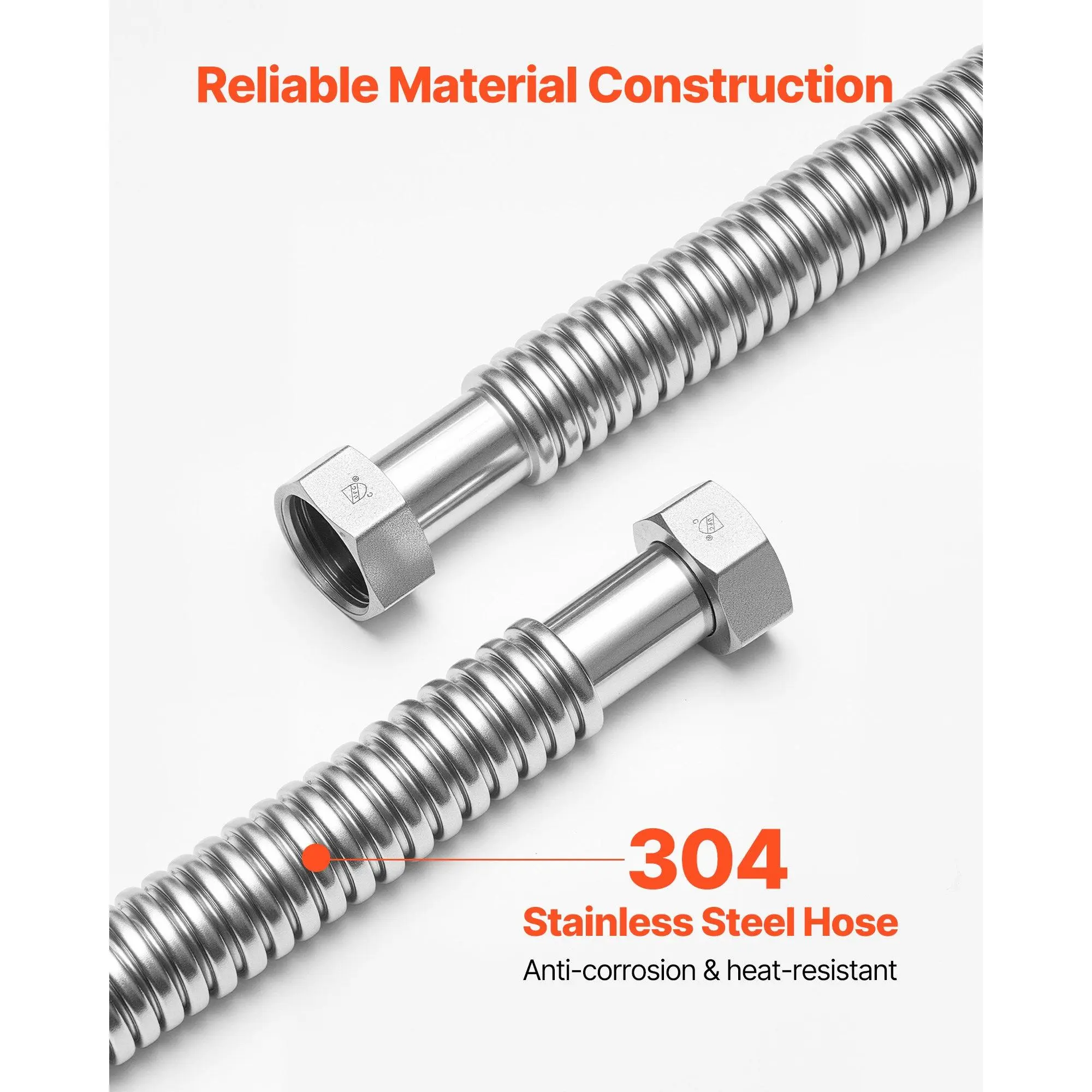 The water heater connector features a 304 stainless steel hose, providing leak-proof, lead-free construction. It is designed to withstand high pressure and high temperatures, ensuring stable performance and long-lasting durability.