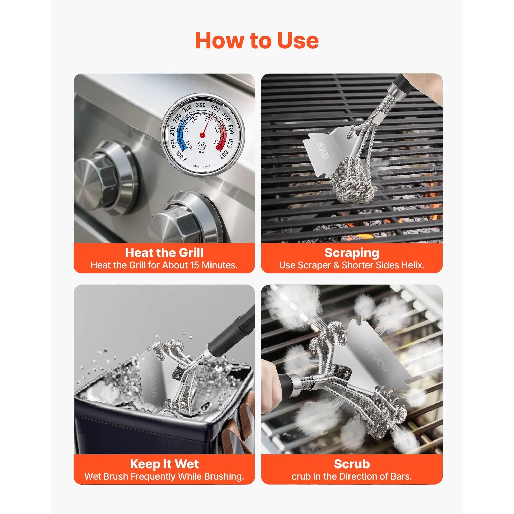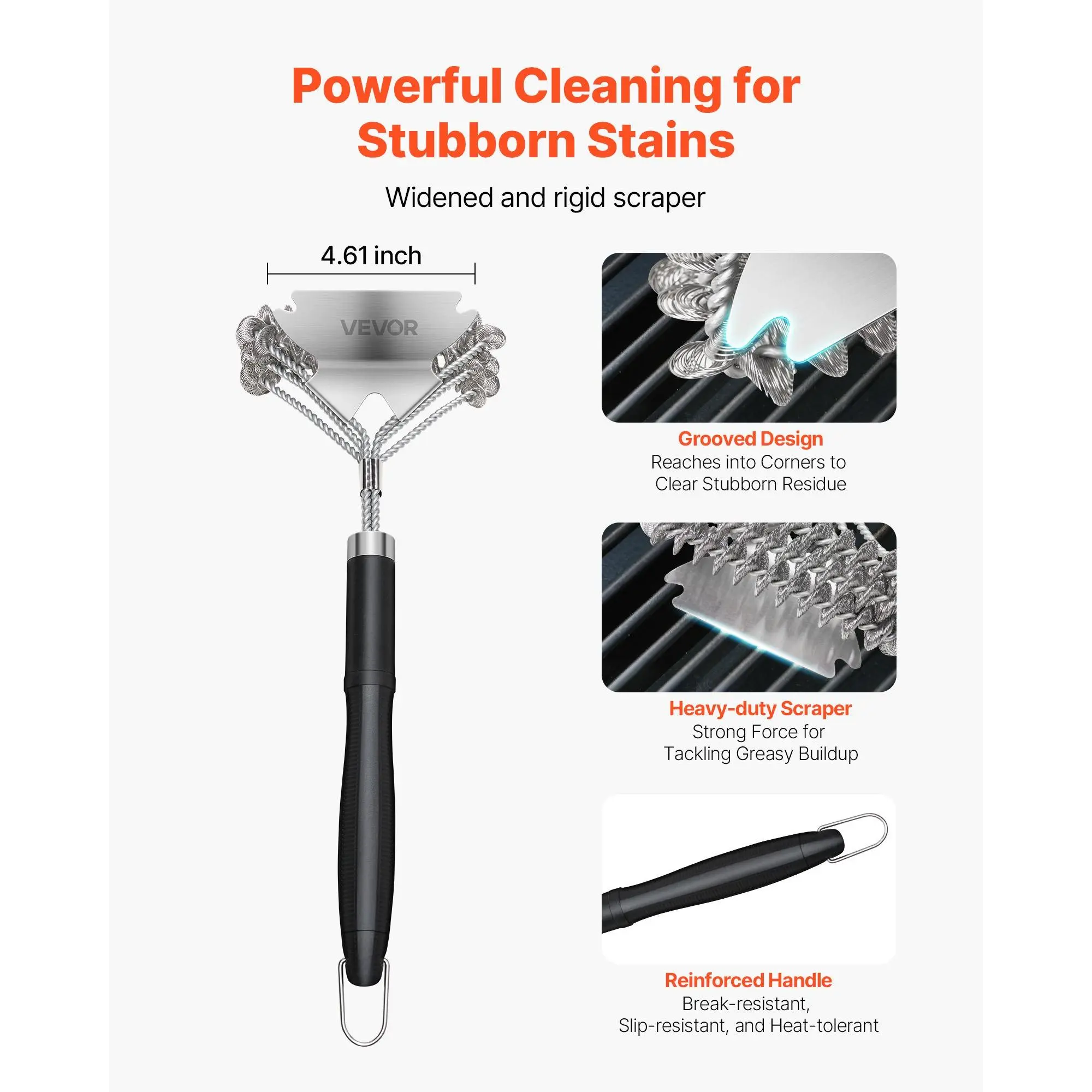 This grill brush provides efficient cleaning with heat-resistant, non-shedding stainless steel wires, ensuring food security. The heavy-duty scraper and 3-row design remove stubborn grease and residue. Made of high-quality stainless steel, its reinforced for durability and ideal for various grills.