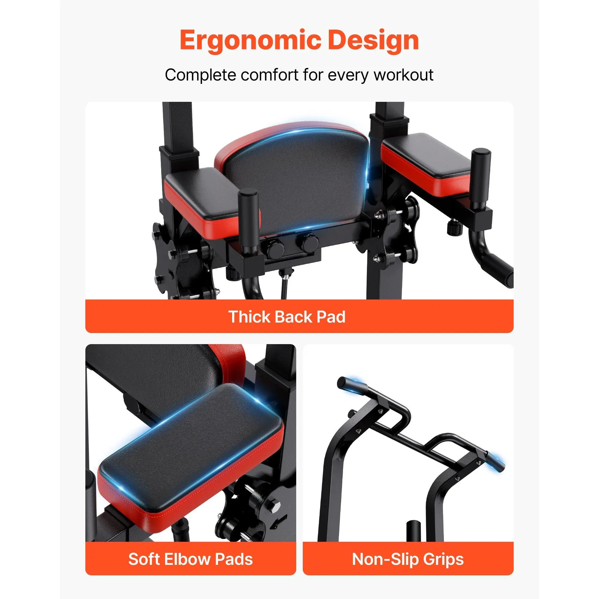Our collapsible pull up bar features a thick backrest that can be laid flat as a support pad to help beginners exert strength or set upright as a backrest to reduce back pressure. The 3-level adjustable soft armrest delivers comfort for your arms, while the non-slip handles provide a secure grip.