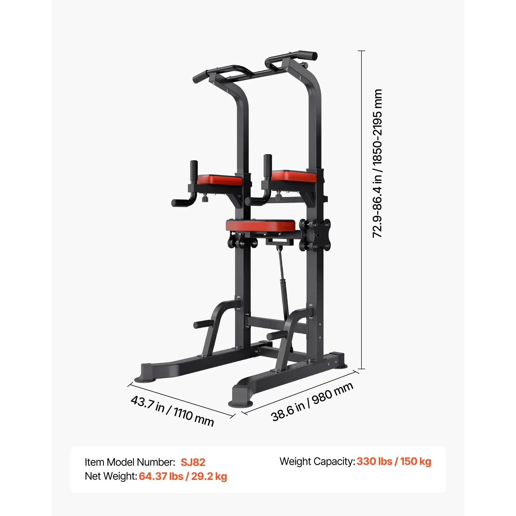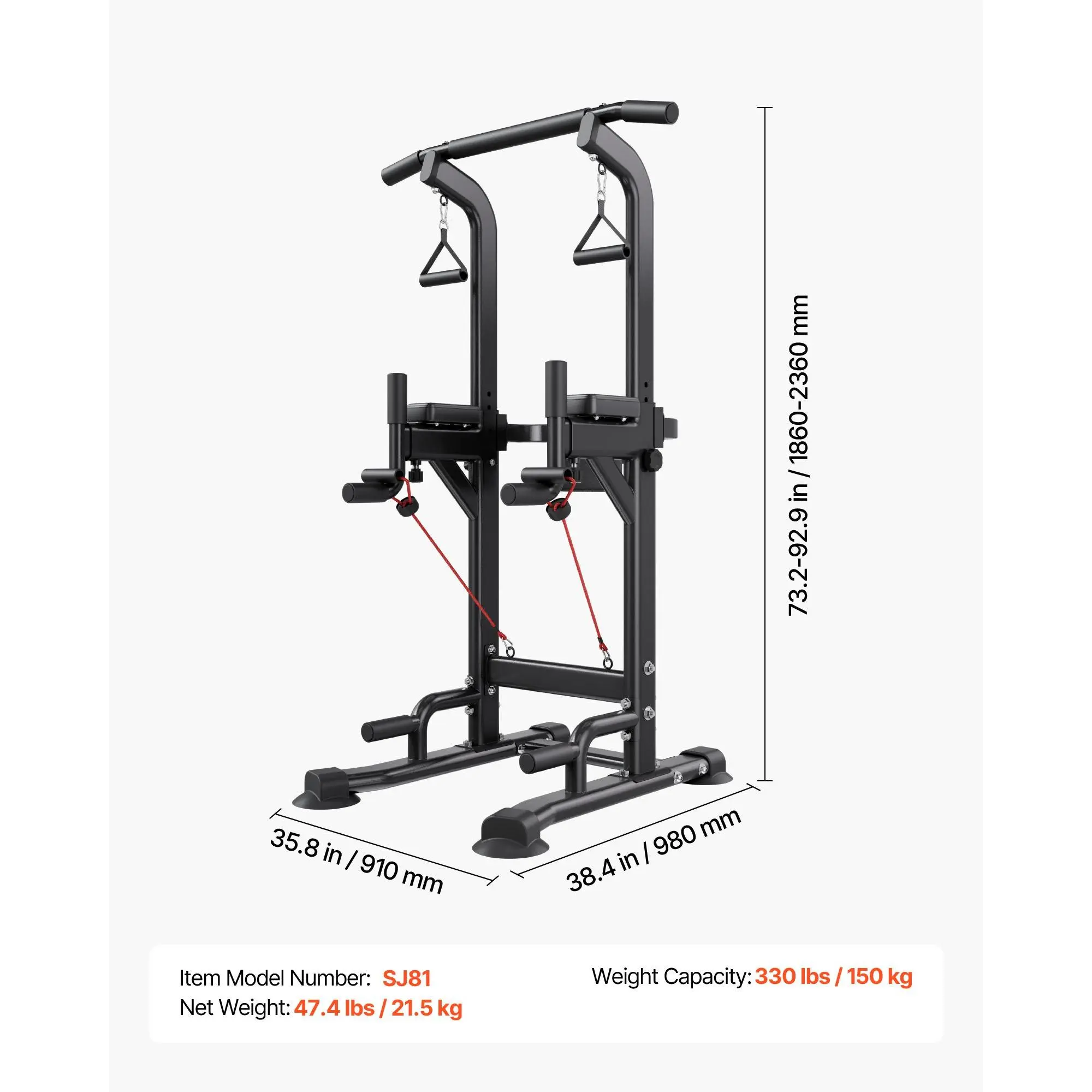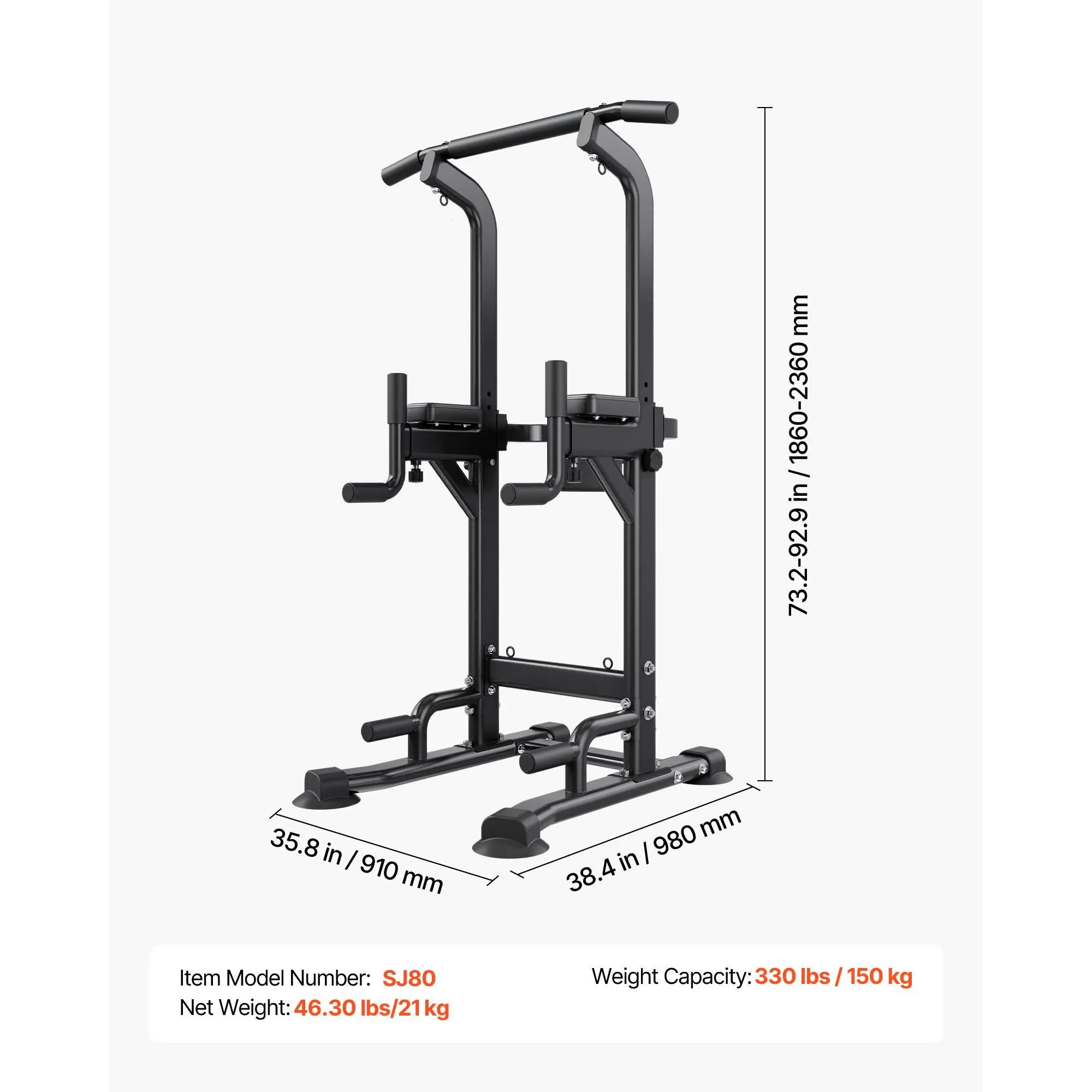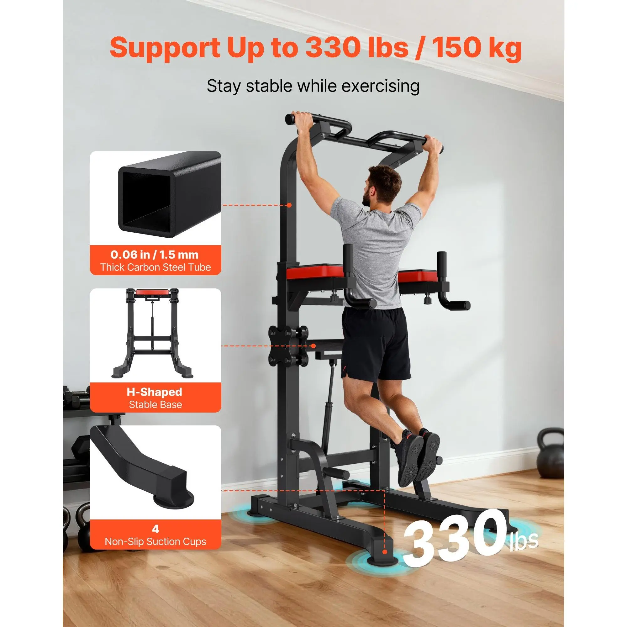 Made of heavy-duty carbon steel and reinforced with a solid base frame, this portable pullup bar station holds up to 330 lbs/150 kg. It remains firm and secure throughout your workout, allowing users of different body weights to train confidently without worrying about wobbling or instability.