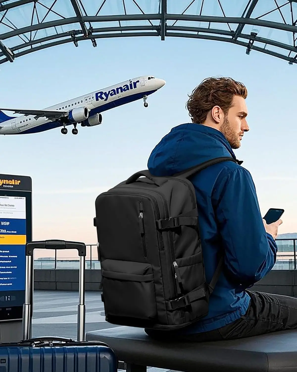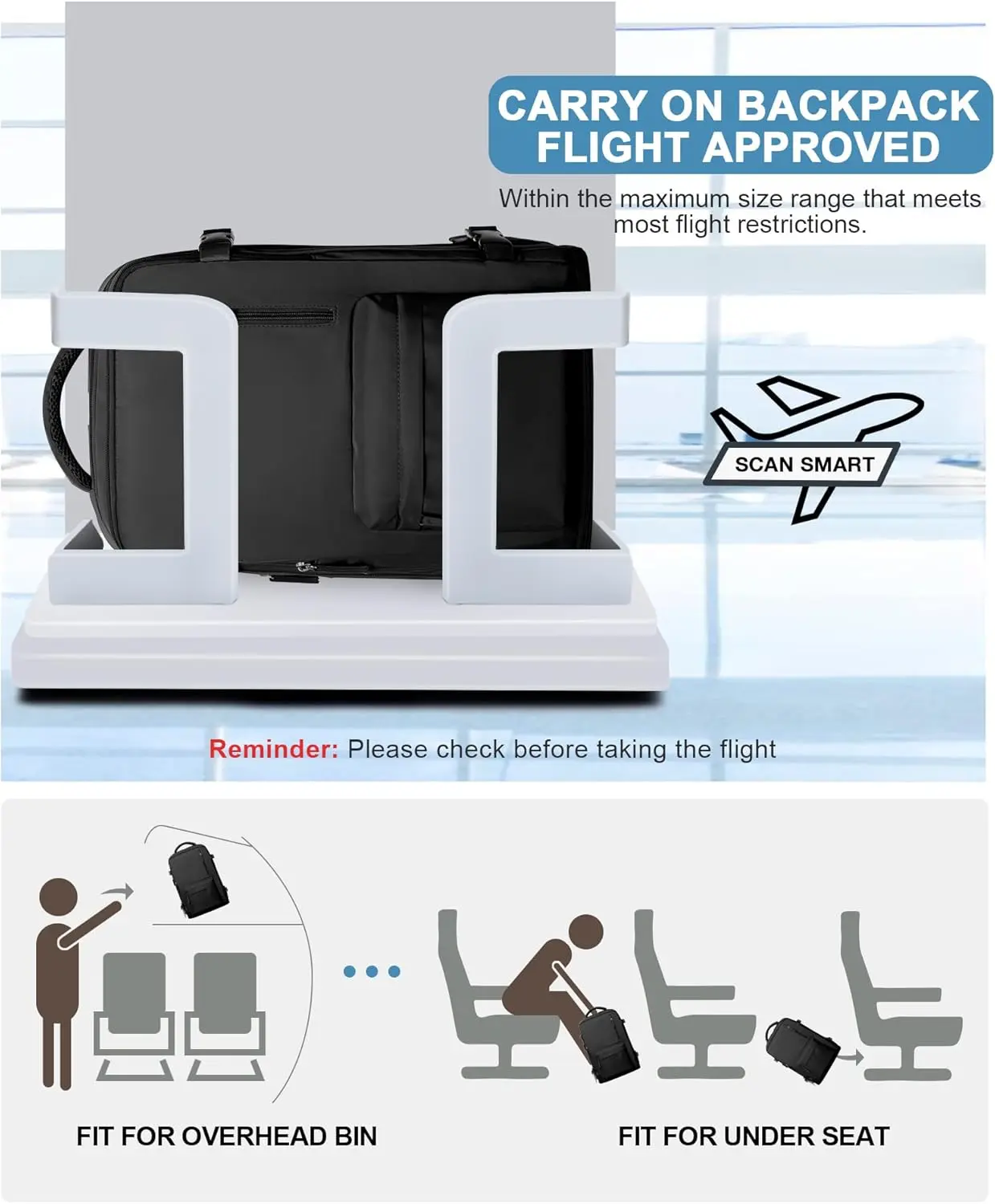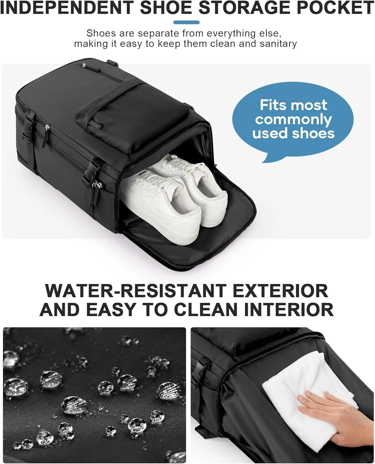 ·【Independent Shoe Compartment & Wet Bag】One shoe compartment on the bottom of backpack carry on to keep the shoes separate and everything else clean. two venting hole in shoe compartment, make it keep breathable to not smelly. The front Wet bag of the flight approved travel backpack with high-density material can help you to separate dry items from wet items like wet clothes or towels