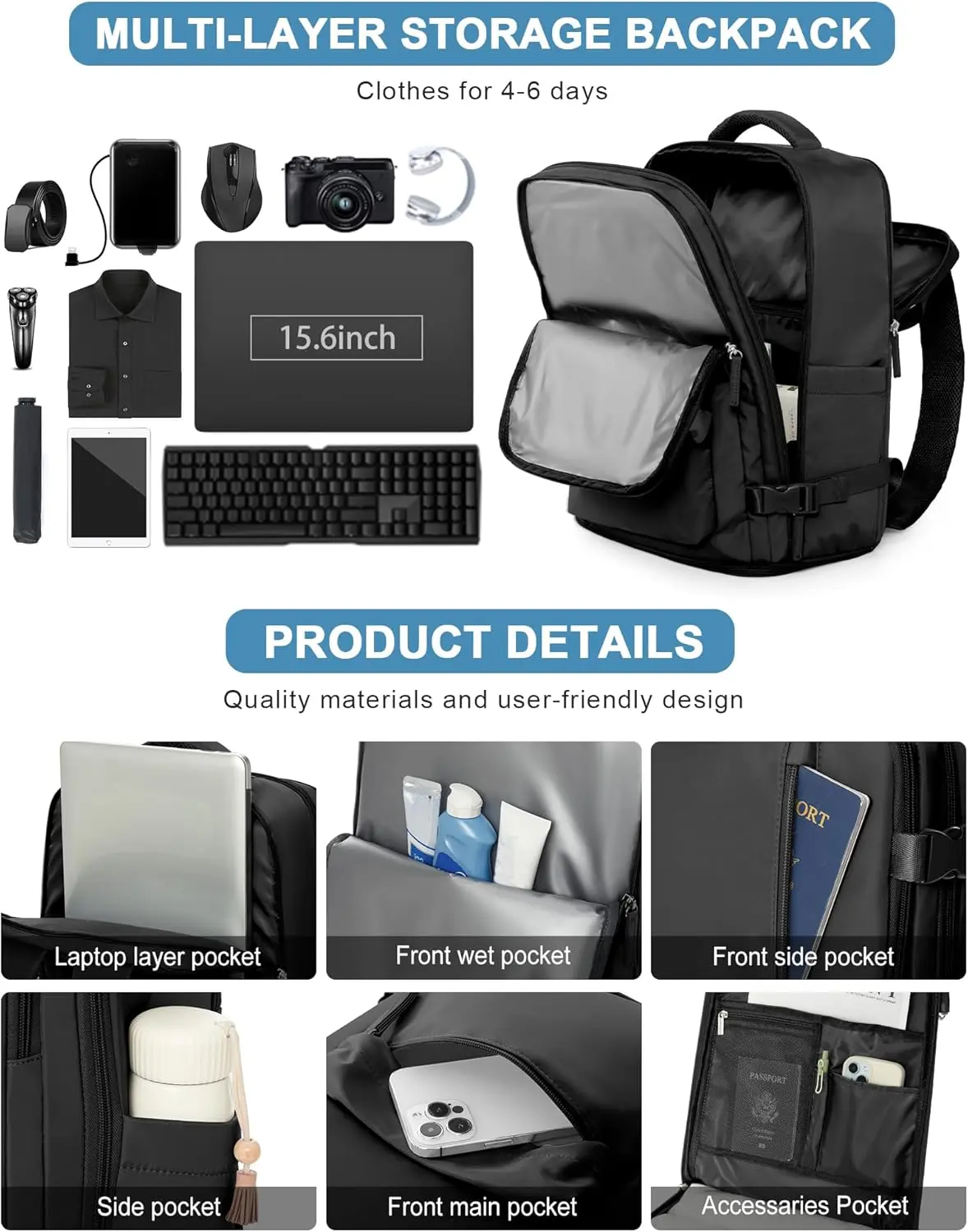 ·【Large Capacity Multi-Pocket Backpack】 Travel backpack with multiple compartments. The main pocket can hold travel items and can accommodate 5-8 pieces of clothing. The main compartment features multiple small compartments for tablets, pens, headphones and other small items, and there is one side pocket and two pockets on the outside for quick access.