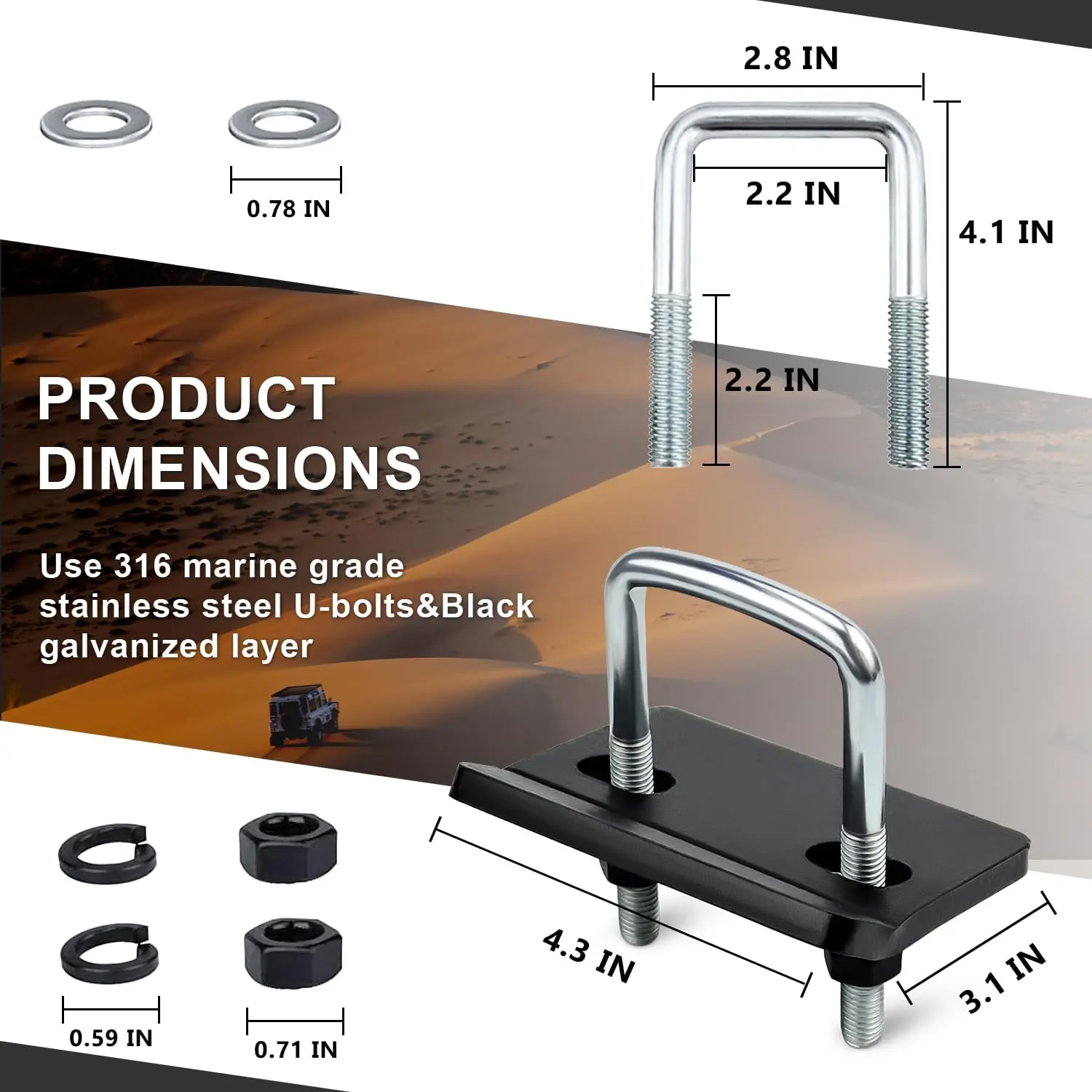 ·[PREMIUM MATERIAL & SAFE DESIGN]Constructed with 316 marine-grade stainless steel 0.4" U-bolts, 2 flat washers, 2 lock washers, 2 nuts, and 0.28" thick black powder-coated steel plate.Galvanized and rust-resistant for long-lasting use without loosening or corrosion.