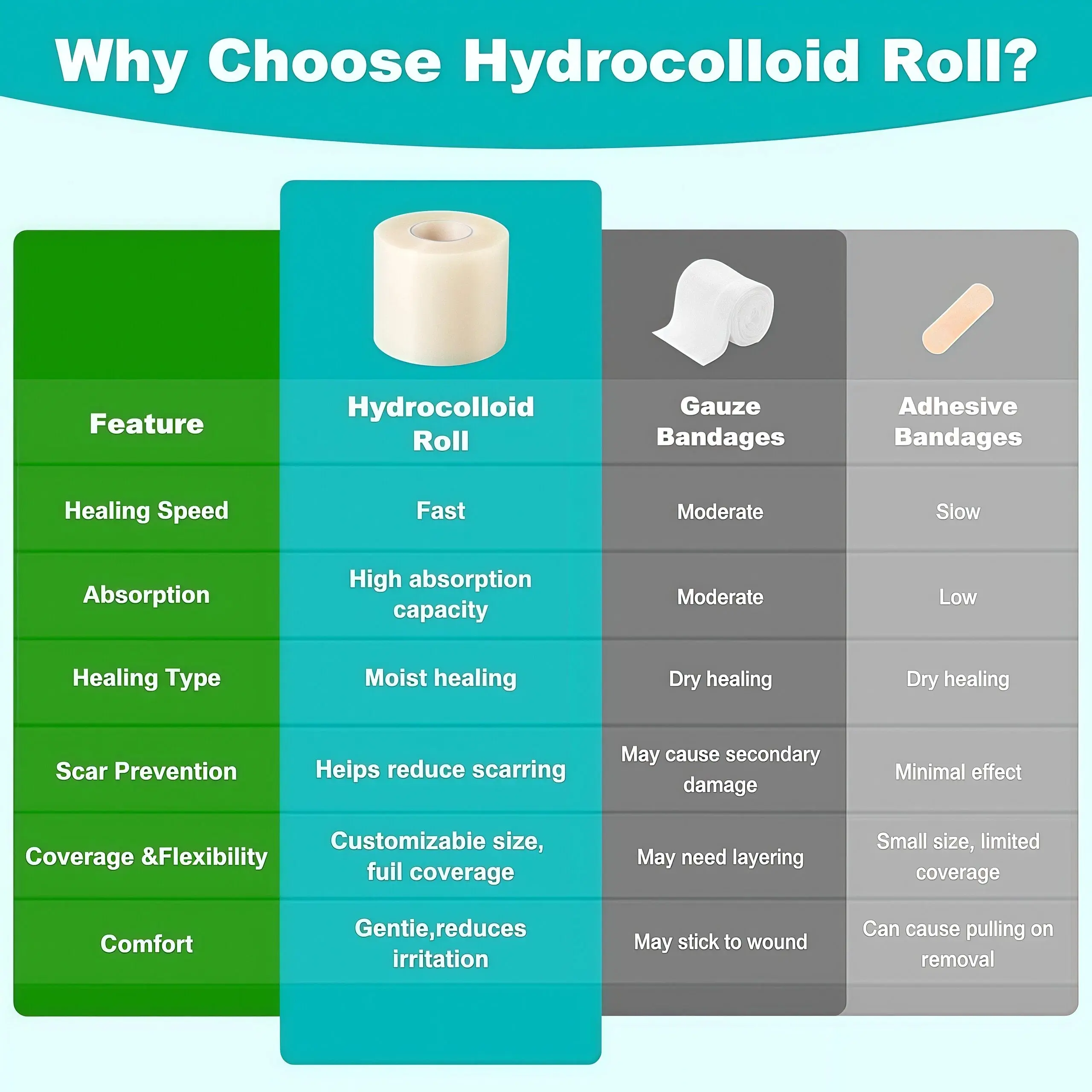 ·Medical-Grade Hydrocolloid Patch: This roll features hydrocolloid bandages designed for effective wound care. Ideal for DIY applications, it offers flexibility and waterproof properties. Perfect for various sizes and shapes.