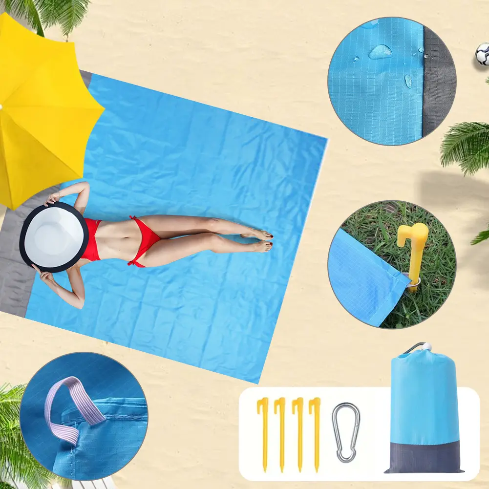 Skin-friendly waterproof beach mat: Sewn polyester fabric, it has good wear resistance and dries quickly, improving your comfort at the beach or outdoor activities. Let your family and friends enjoy the sea and sun on the summer beach!