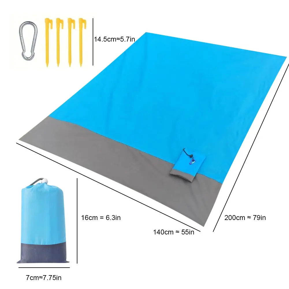 DESIGN: The extra large beach mat is specially designed for family travel, providing enough space to lie down, rest and relax. Beach mat waterproof set includes 1 beach blanket, 4 stakes, 1 carabiner. Beach blanket
