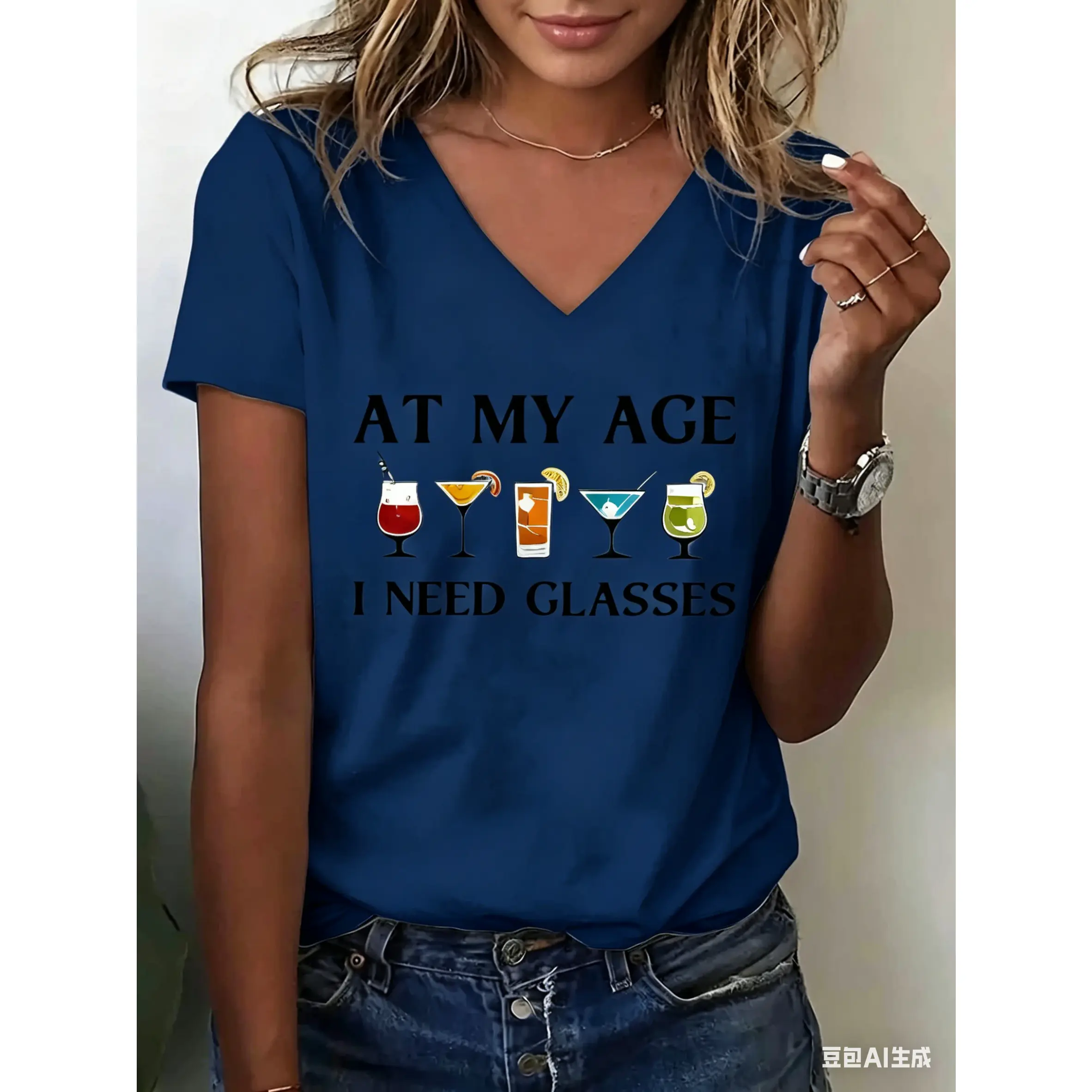 Trendy V-neck T-shirt, standard size, printed with the words "At my age, I need glasses."