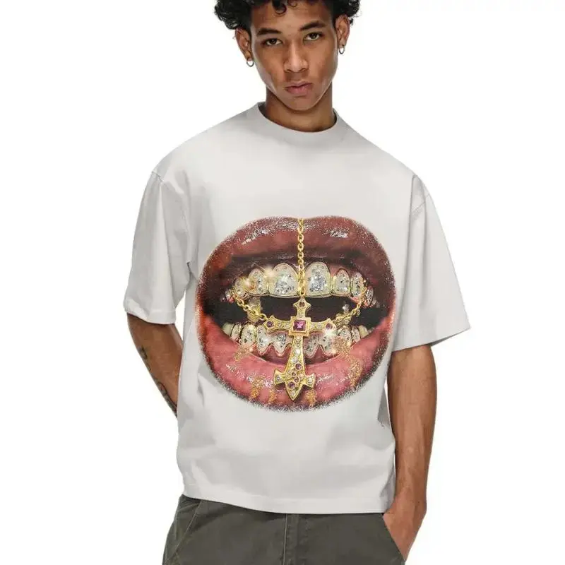 5. 2026 Viral Iced Out Grillz Cross Graphic T-Shirt, Men's Hip Hop Streetwear Tee, Bling Diamond Grill Cotton Top
